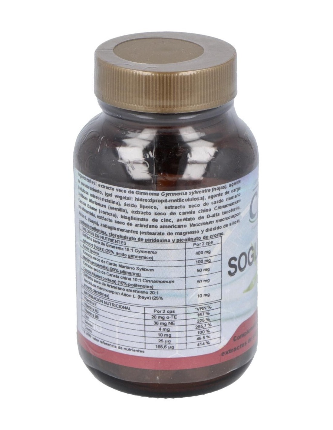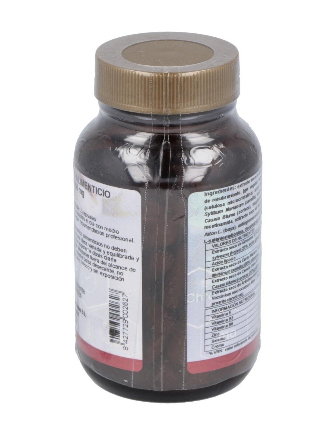 Gymnema silvestre (E. estandarizado 25% ácidos gimnémicos), Extracto seco de Canela china (Cinnamomum cassia) DT2 10:1, Extracto de mirtilo 25% antocianidinas (vaccinium myrtillus), Picolinato de Cromo (equiv. a 100 mg. de Cr elemental), Zinc bisglicinato, Vitamina E (alfa tocoferol acetato equiv. a 10 mg. alfa-TE), Vitamina B 6 (Piridoxina), Vitamina B3 (Niacinamida), Seleniometionina (equiv. a Se elemental 25 mcg.), Acido alfa lipoico, Extracto cardo mariano (80% silimarina).