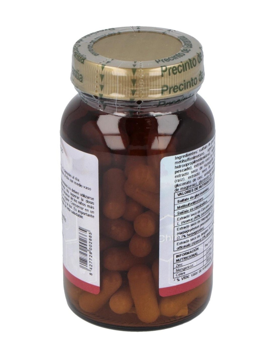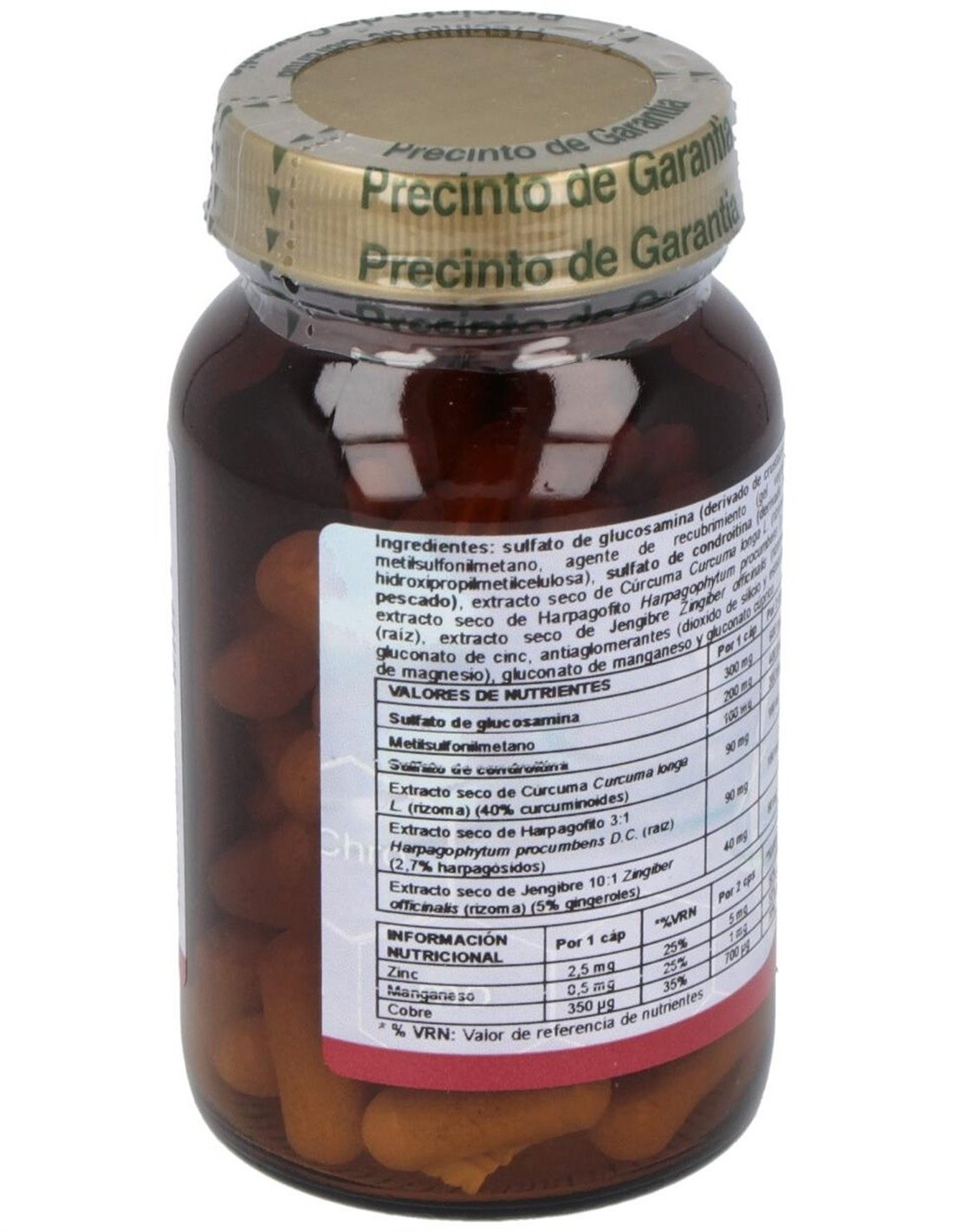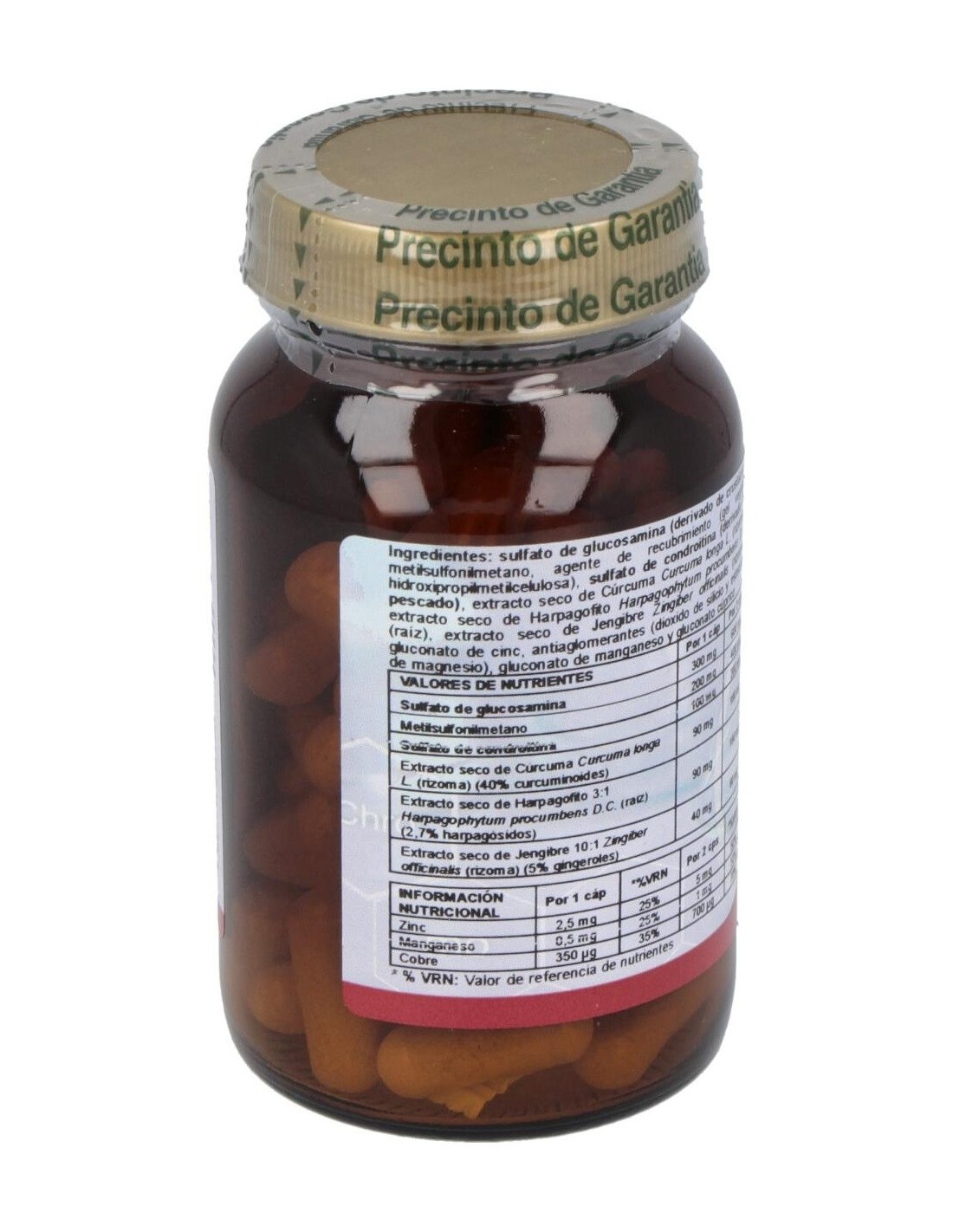 Sulfato de glucosamina 300 mg; Metil sulfonil metano (MSM) 200 mg; Sulfato de Condroitina 100 mg;. Manganeso (aminoquelado) 0,5 mg; Cobre aminoquelado 0,25 mg; Zinc (aminoquelado) 17% CDR 2,5 mg; Ext. estandarizado de Curcuma longa 90 mg; Ext. estandarizado de Jengibre 40 mg; Ext. estandarizado de Harpagofito 90 mg.