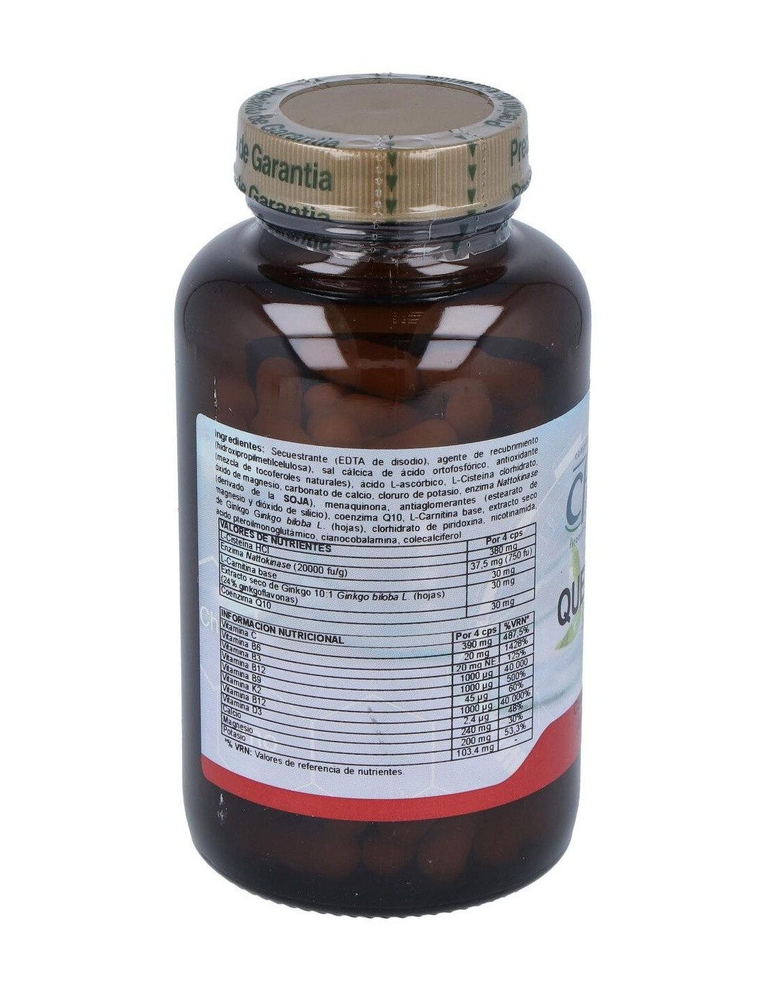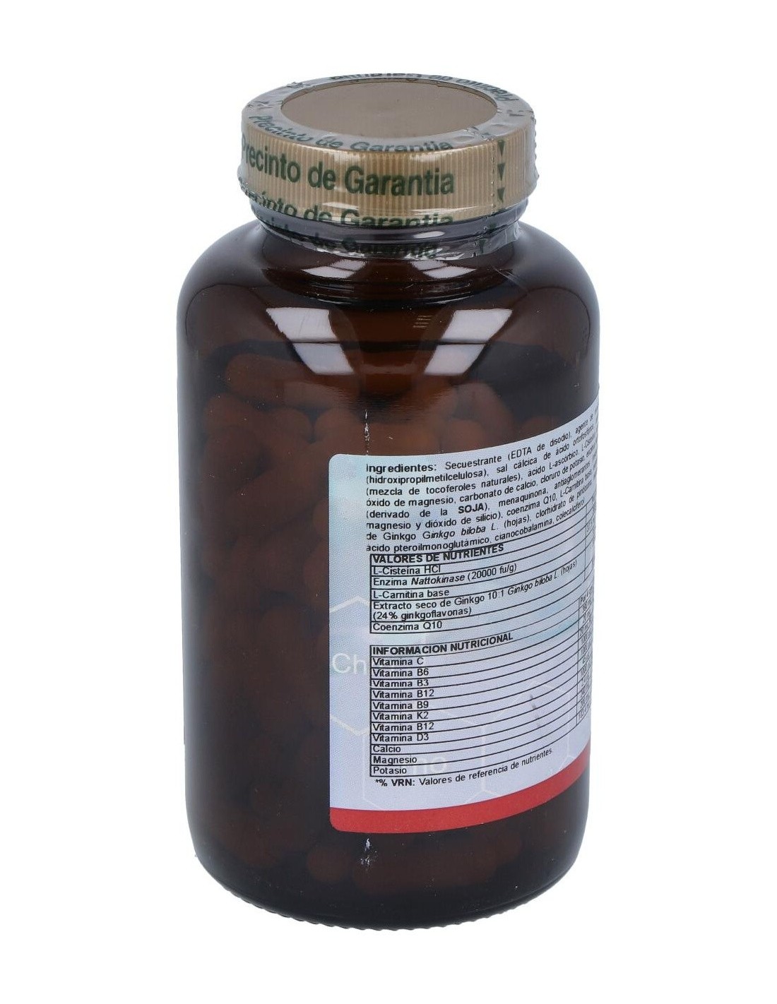 Vitamina C (ácido ascórbico) (400mg), Vitamina E (Mezcla de tocoferoles) (400UI), Niacina (20mg), Vitamina B6 (como Piridoxina HCI) (25mg), Ácido Fólico B9 (100mcg), Vitamina B12 (como cianocobalina) (100mcg), Calcio (carbonato) (300mg), Magnesio (oxido) (200mg), Potasio (cloruro) (200mg), L-Cisteina (como cisteína HCI) (380mg), COQ10 (como ubiquinona) (30mg), L-Carnitina (30mg), Ginkgo Biloba (estandarizado 50/1) (30mg), Nattokinasa (20.000 fu/g actividad fibrinolítica) (75mg), Vitamina D-3 (0,0024mg), EDTA (como disódico férrico) (600mg).