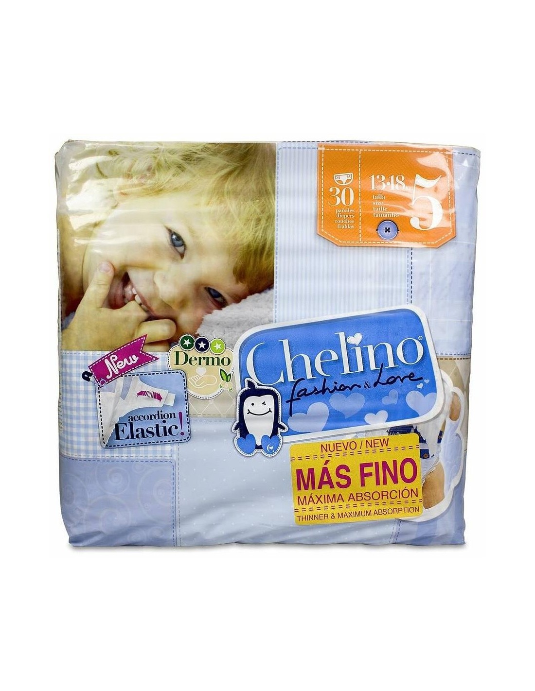 Los pañales Chelino®, protegen y cuidan de la piel del bebé, además de aportarle confort y libertad de movimiento en cada etapa de su crecimiento. La talla 5 está diseñada para bebés con un peso comprendido entre 13 a 18 kilos.
