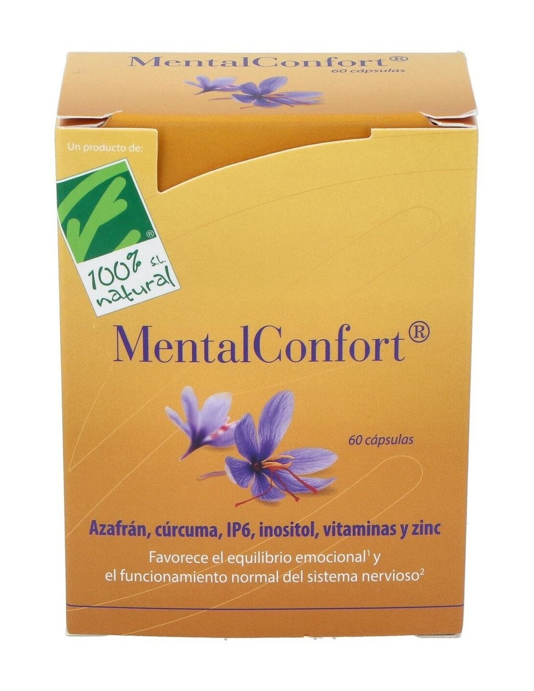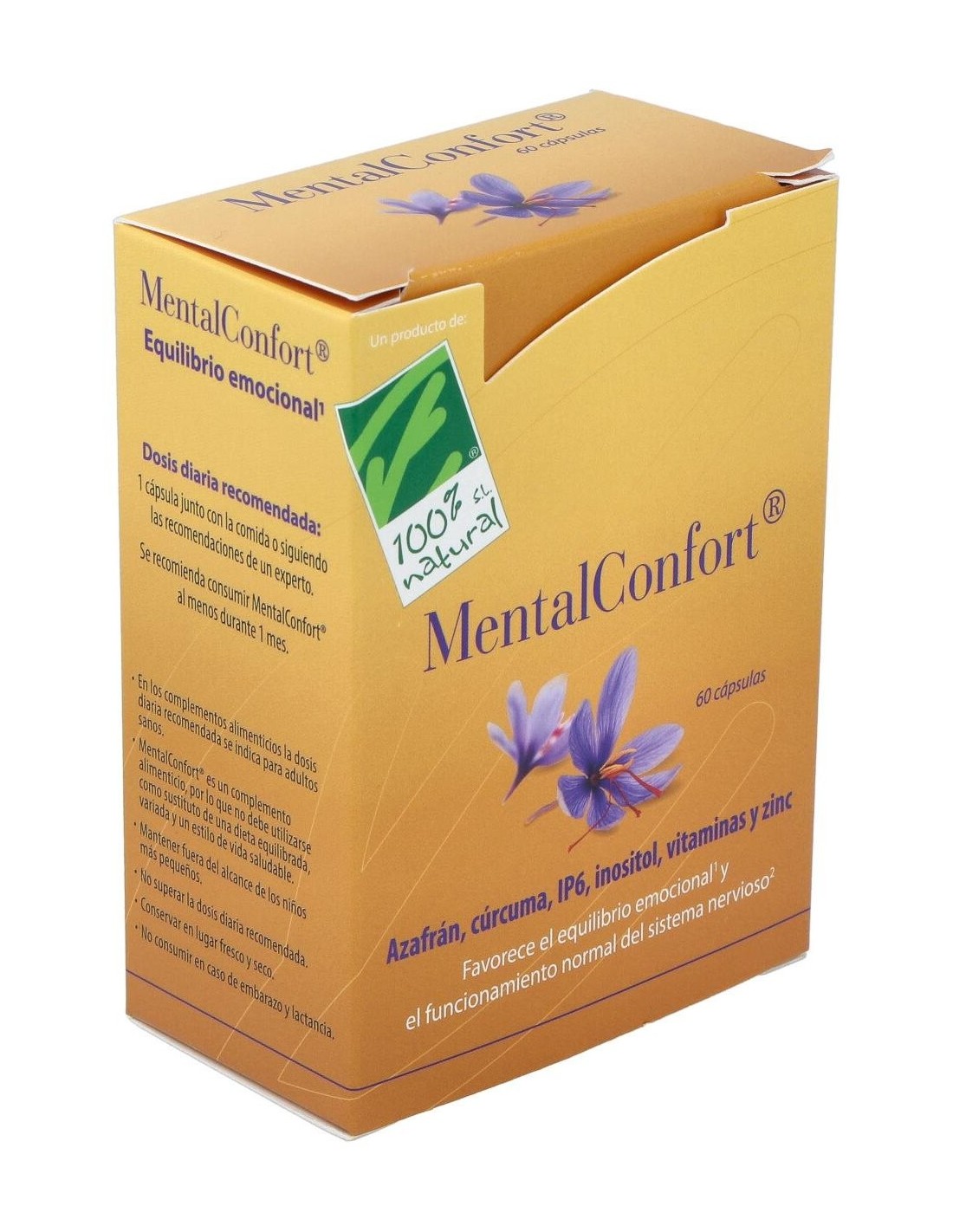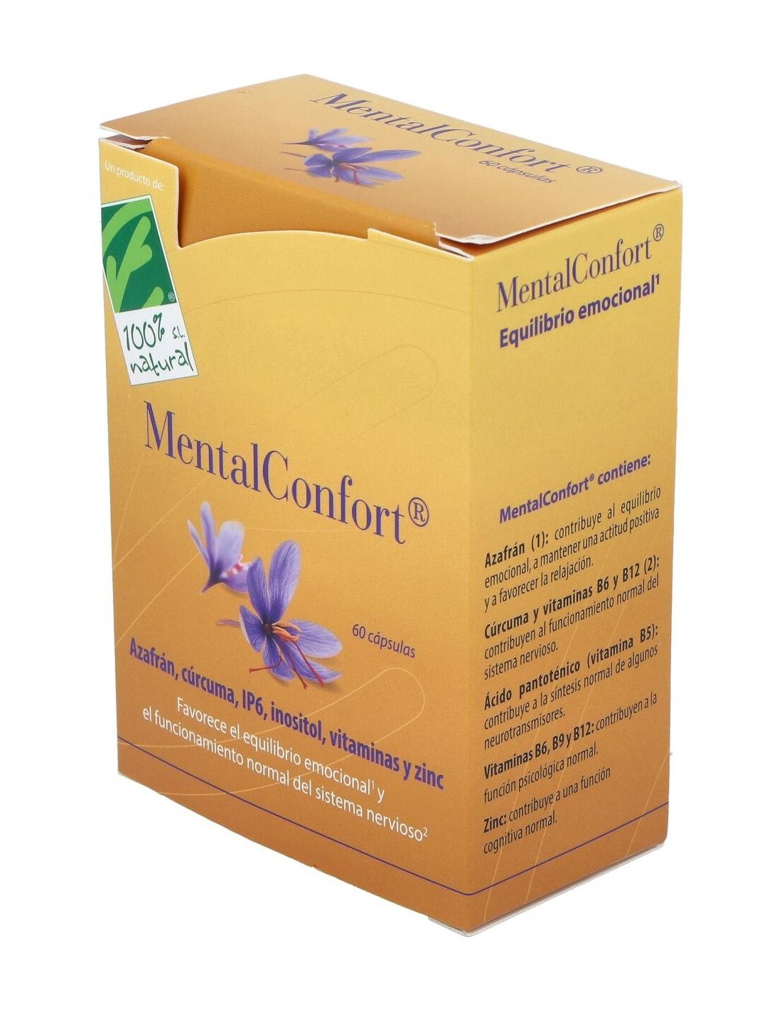 100% Natural Mental Confort 60 cáps vegetales es un complemento alimenticio a base de extractos de estigmas de azafrán y cúrcuma fitosomada junto con una fórmula de IP6 y mio-inositol que ayudan a mantener un buen equilibrio emocional y estimula el buen humor mientras favorece el funcionamiento normal del sistema nervioso.