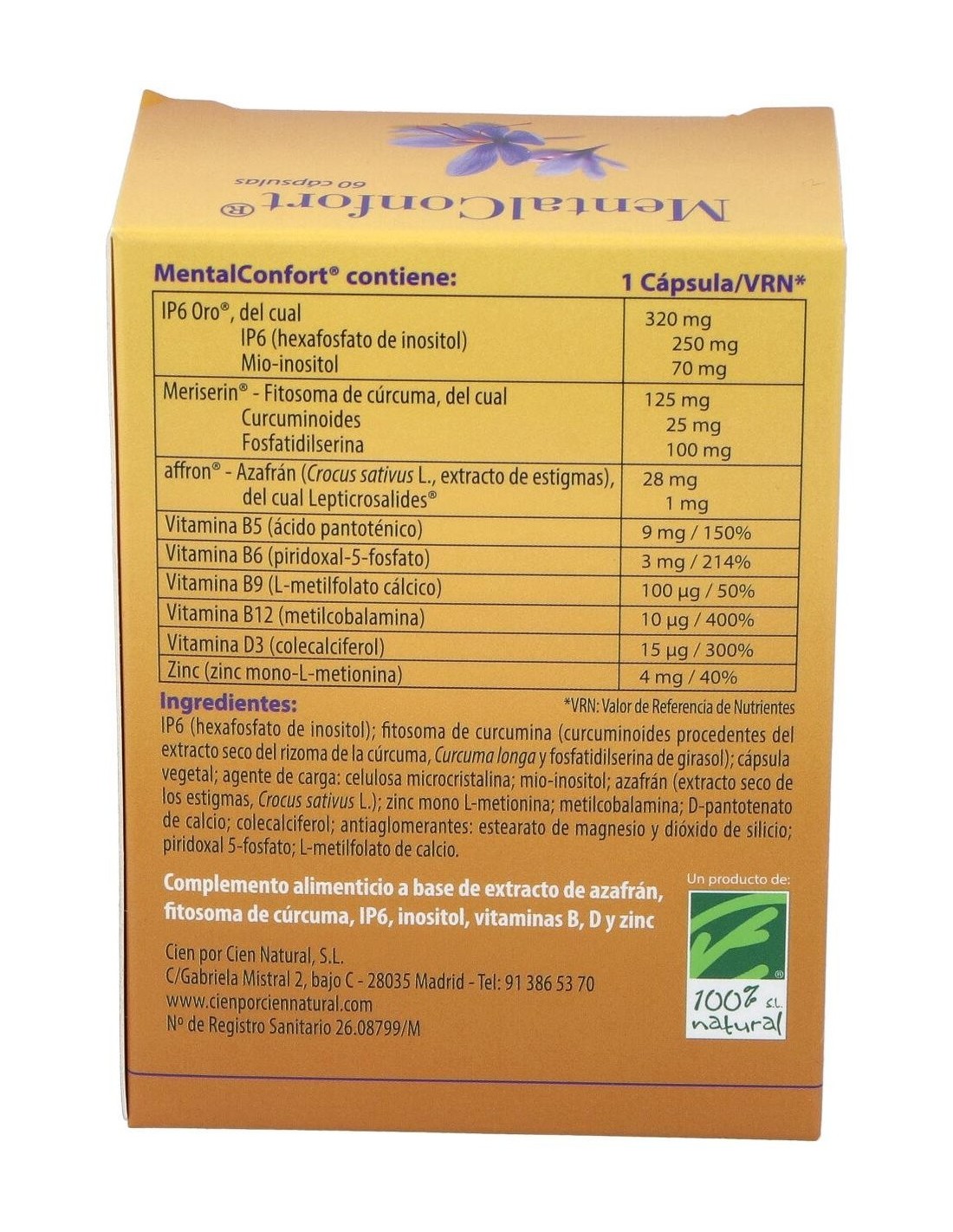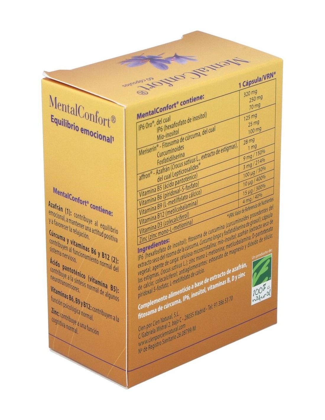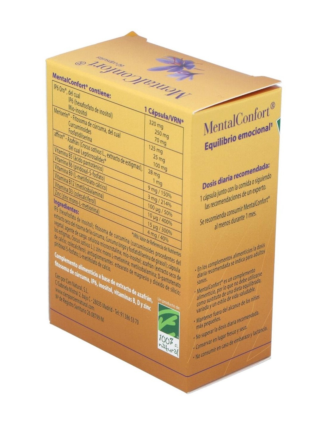 100% Natural Mental Confort 60 cáps vegetales es un complemento alimenticio a base de extractos de estigmas de azafrán y cúrcuma fitosomada junto con una fórmula de IP6 y mio-inositol que ayudan a mantener un buen equilibrio emocional y estimula el buen humor mientras favorece el funcionamiento normal del sistema nervioso.