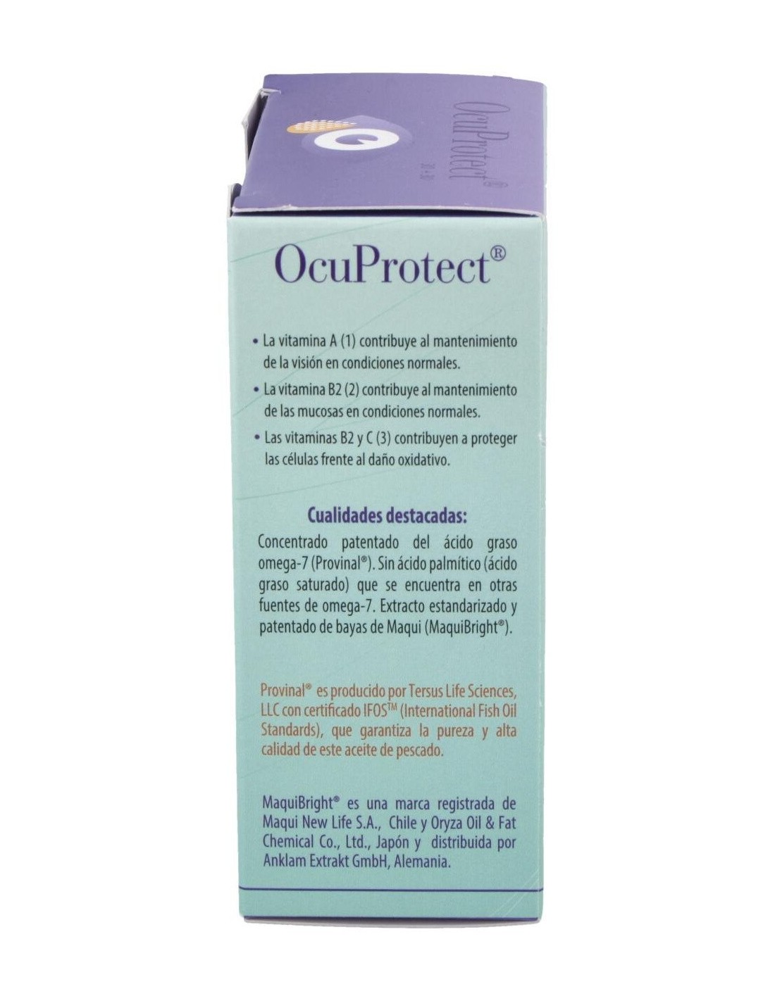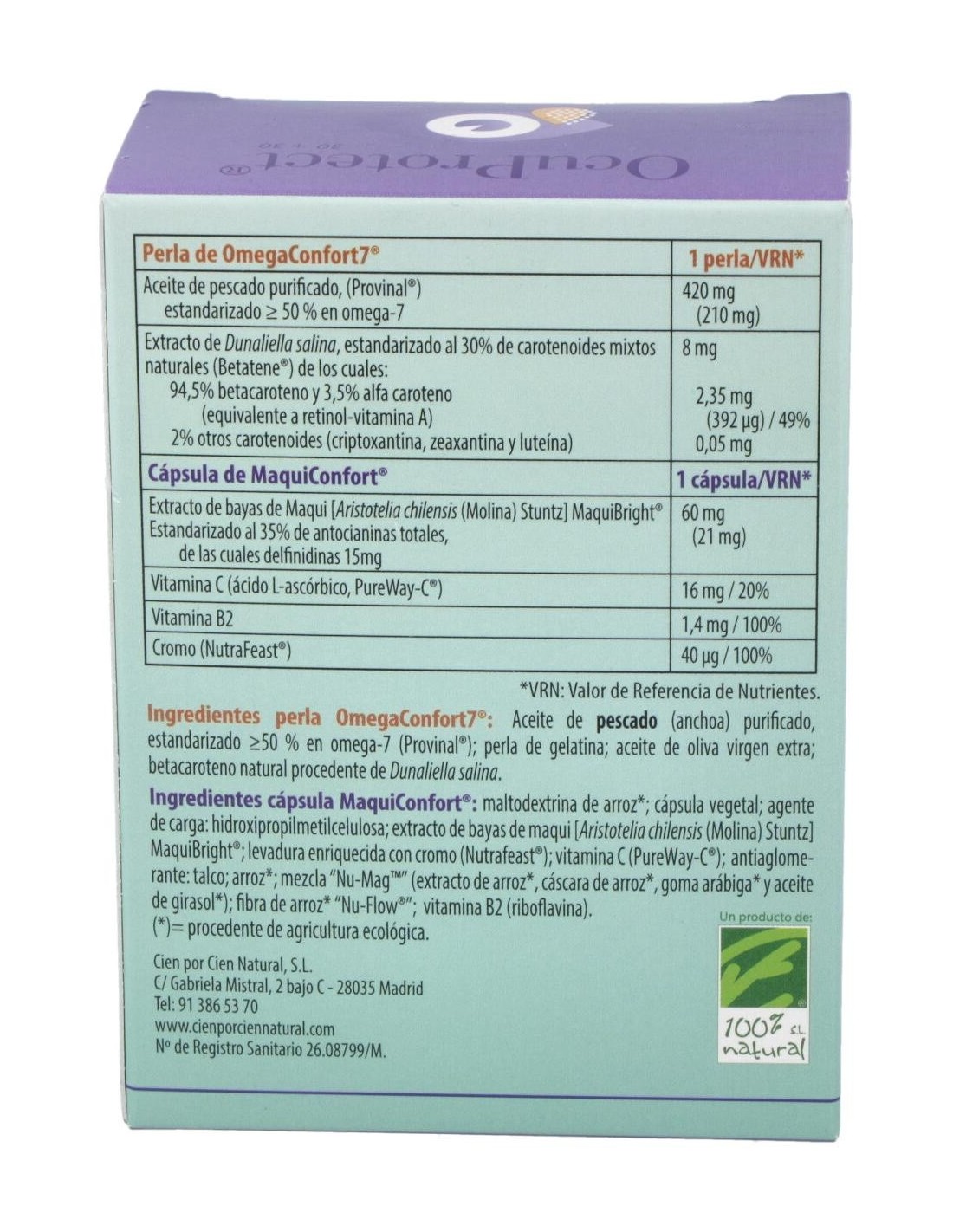 Por 1 cápsula lila: almidón pregelatinizado, cápsula vegetal, extracto de bayas de maqui Maquibright (60 mg), extracto seco de dunaliella salina teod (12,63 mg), silicato de magnesio, sales de magnesio de ácidos grasos y dióxido de silicio.