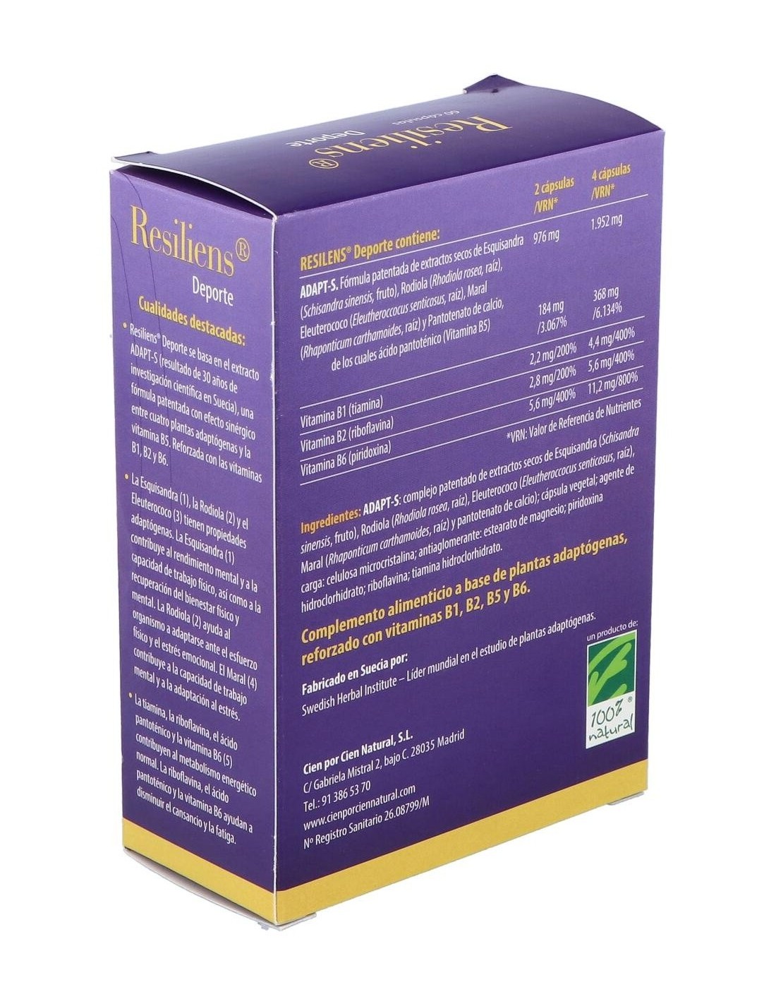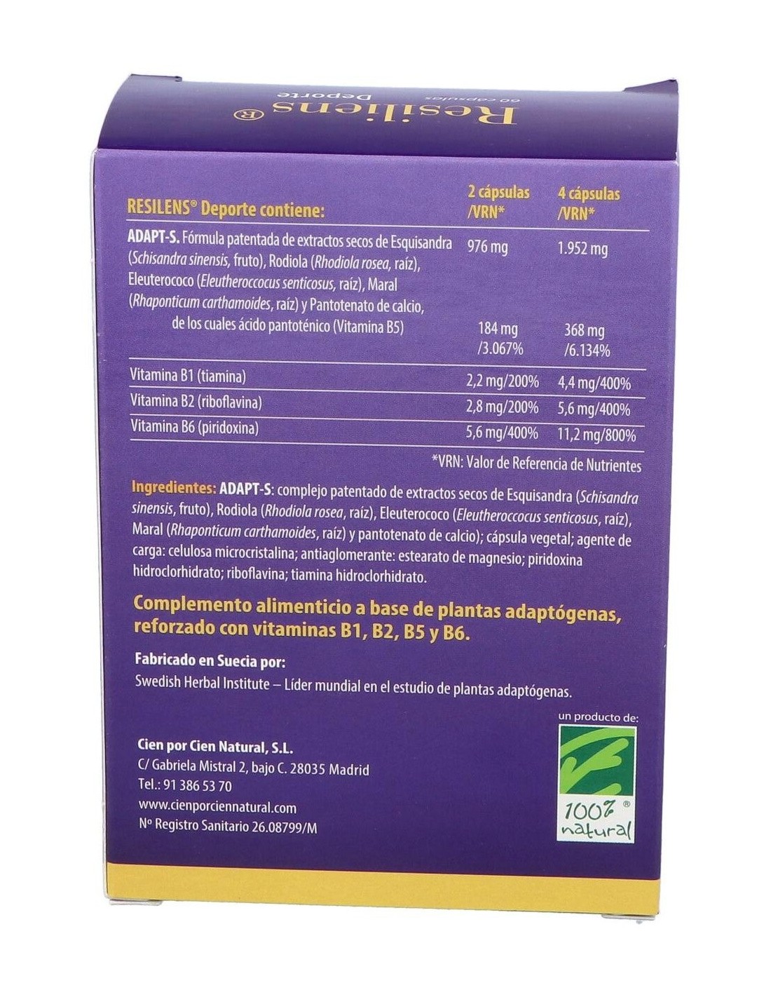 Fórmula patentada que contiene el complejo ADAPT-S con efecto sinérgico entre tres plantas adaptógenas la Esquisandra, la Rodiola y el Eleuterococo, más otra interesante planta, el Maral, y la vitamina B5. La fórmula se refuerza con las vitaminas B1, B2 y B6, que ayudan a mantener altos niveles de rendimiento físico y mental.
