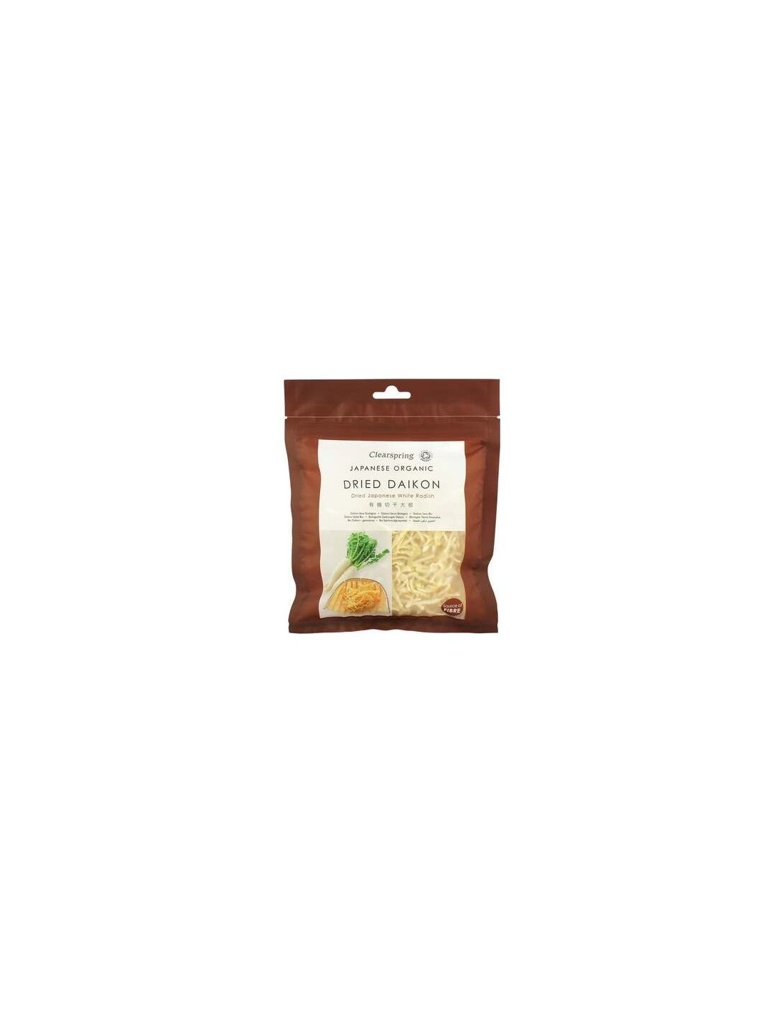 Un alimento extremadamente versátil que es una de las verduras por excelencia en la dieta japonesa. Clearspring Organic Dried Daikon está hecho sin colorantes ni aditivos y con métodos tradicionales consagrados. La raíz de daikon fresca simplemente se lava, se tritura en juliana y luego se seca durante más de seis horas. Este proceso de secado lento le da al daikon un sabor dulce y suave especialmente concentrado y conserva la mayor parte de su valor nutricional.