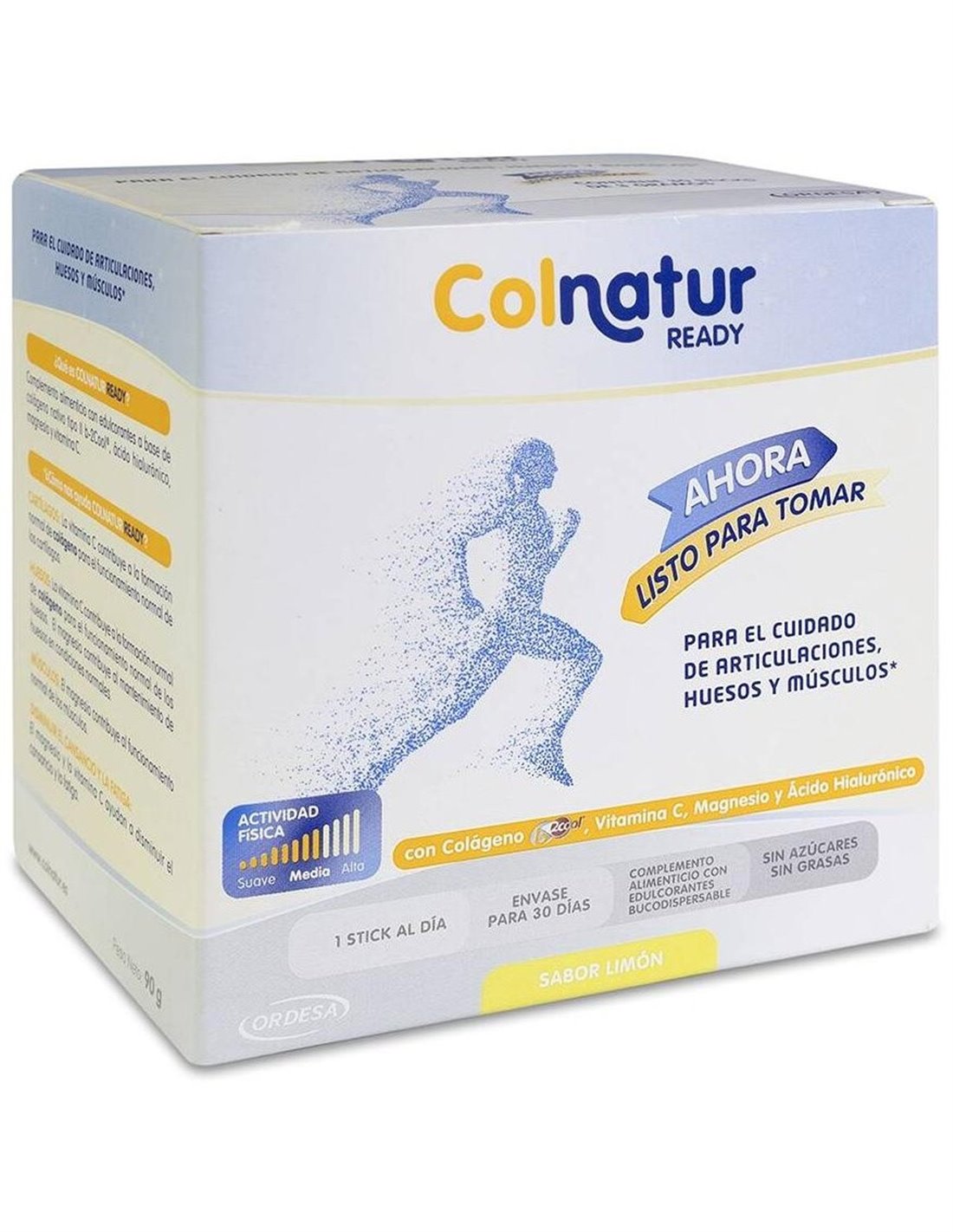 Suplemento en sticks bucodispensables con edulcorantes a base de colágeno nativo tipo II b-2Cool®, ácido hialurónico, magnesio y vitamina C. La vitamina C contribuye a la formación normal de colágeno para el funcionamiento normal de los cartílagos. El magnesio contribuye al funcionamiento normal de los músculos. Sabor limón.
