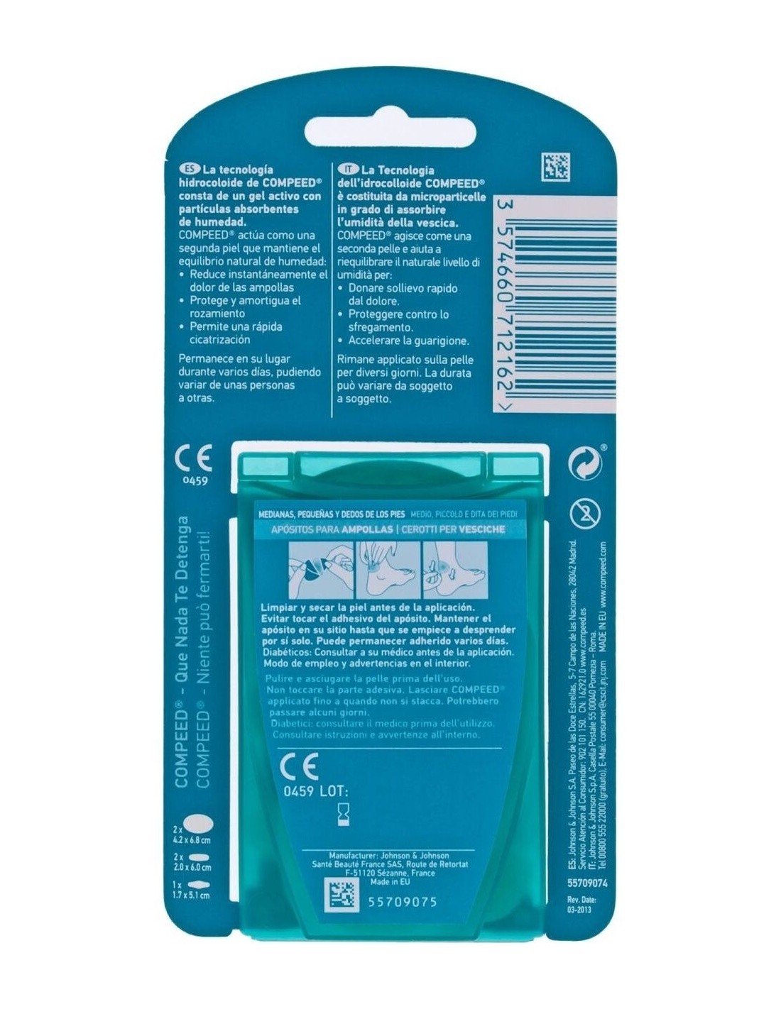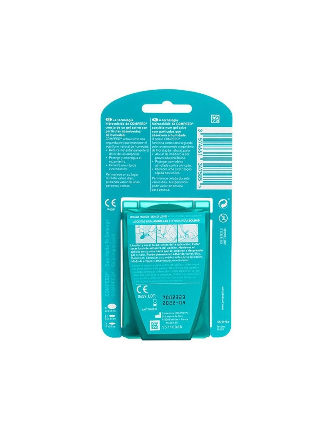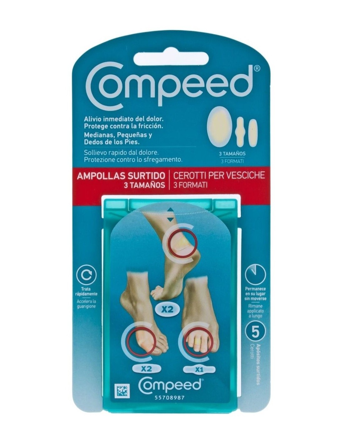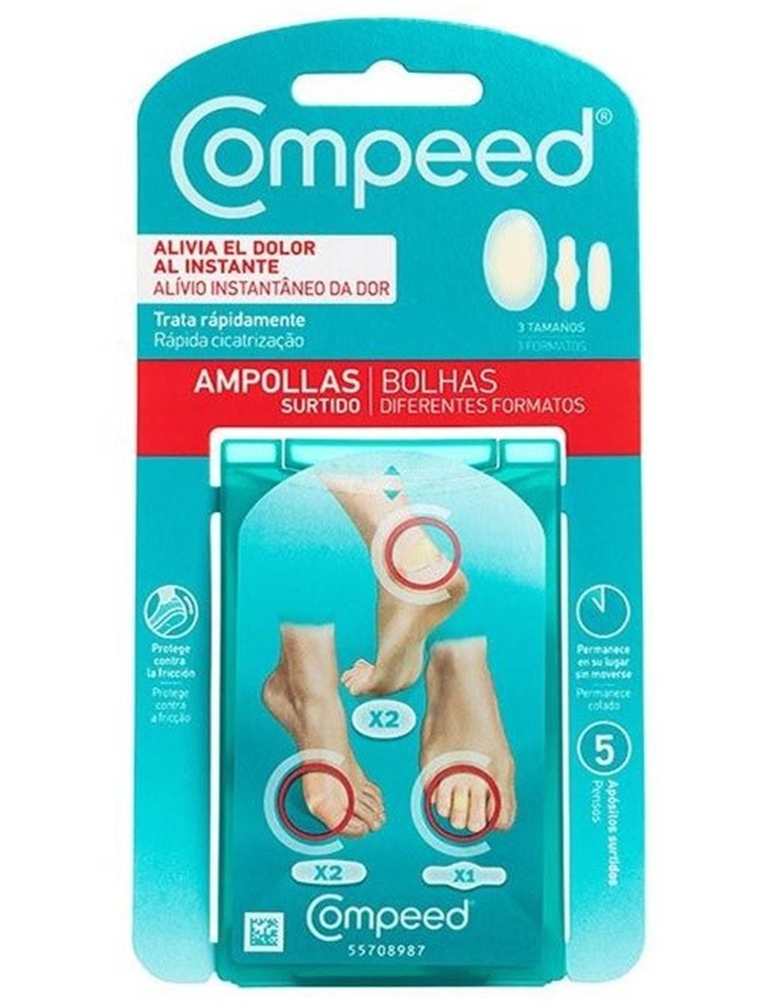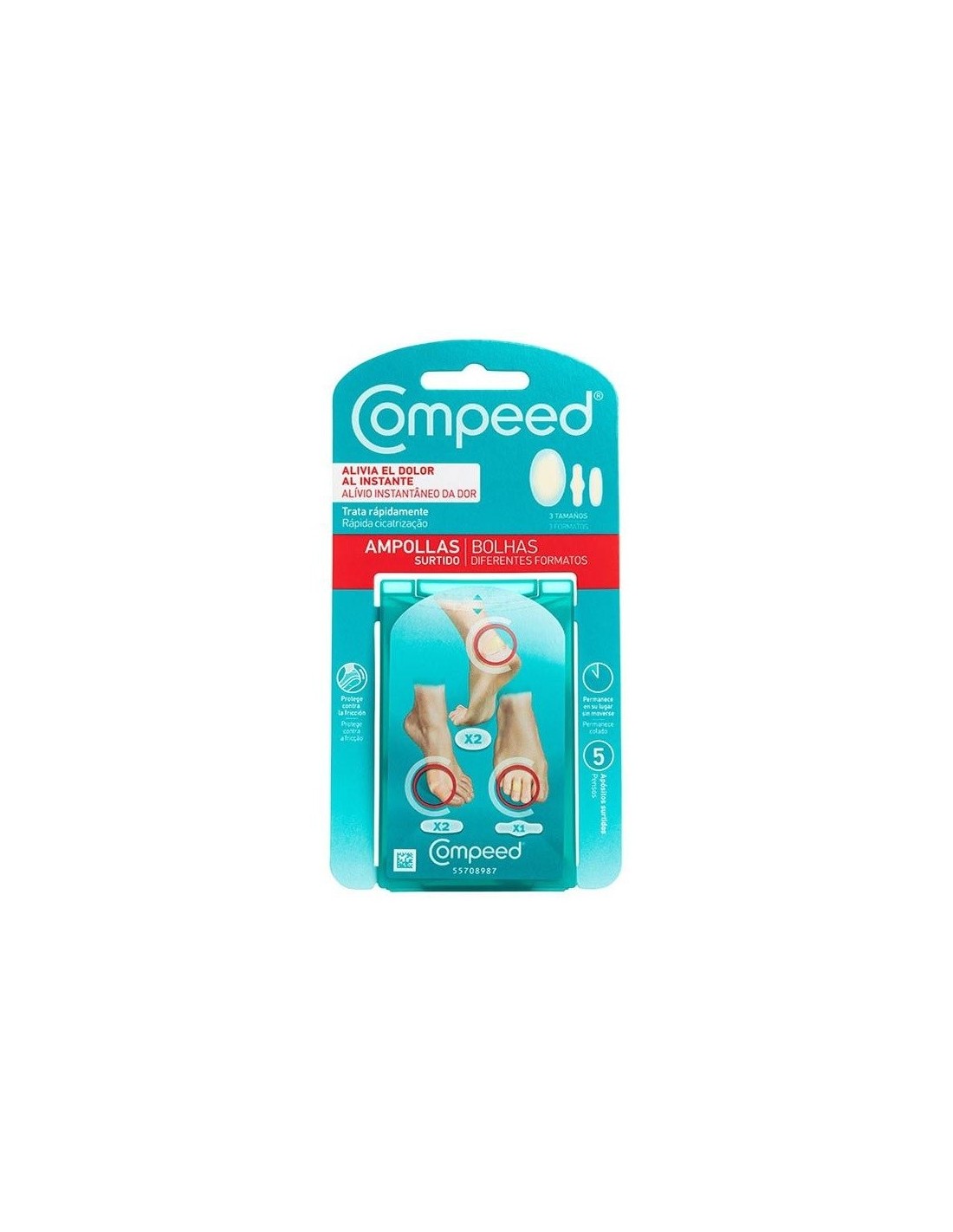 Con diferentes tamaños y formas, Compeed® ampollas apósitos surtidos ofrece una tecnología hidrocoloide que actúa como segunda piel, ofreciendo: