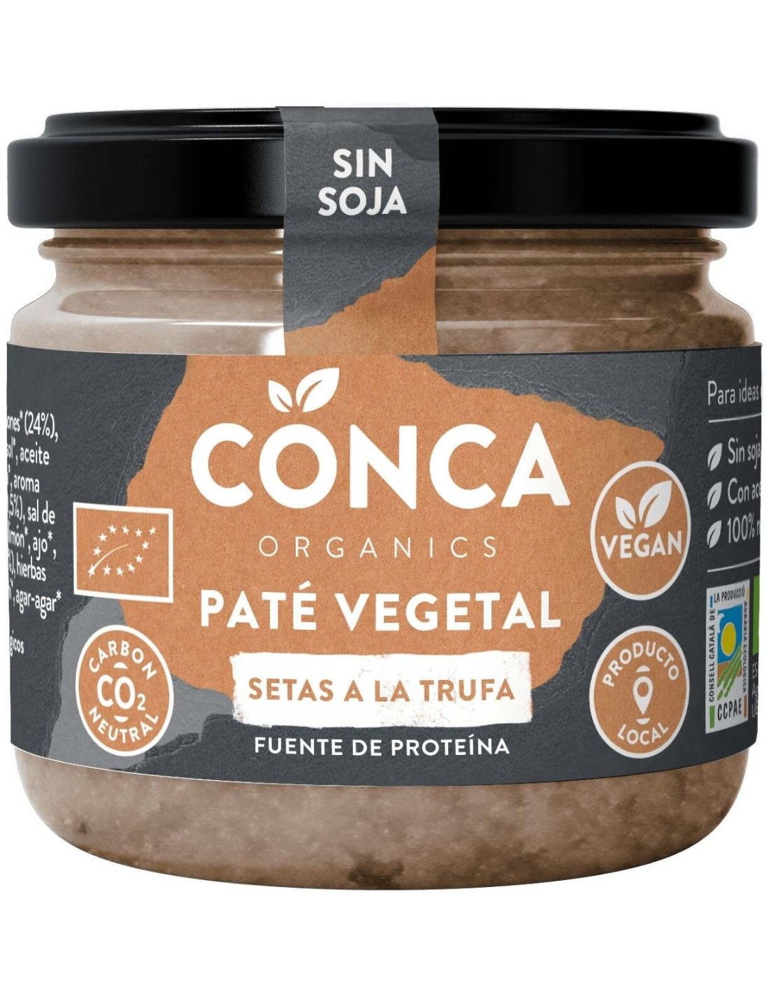 CONCA ORGANICSPaté vegetal a base de setas, trufa, legumbres, aceite de oliva virgen, hierbas aromáticas y agar agar. Rico en proteínas. Libre de OMG, sin fécula de patata, soja, aceite de palma ni aceite de girasol.
