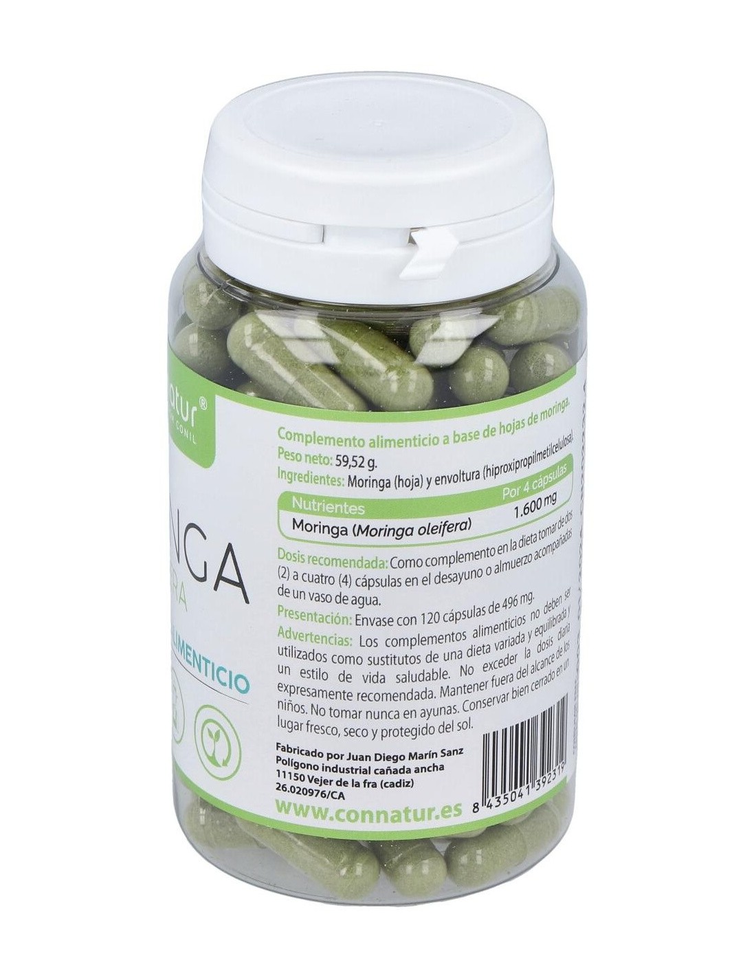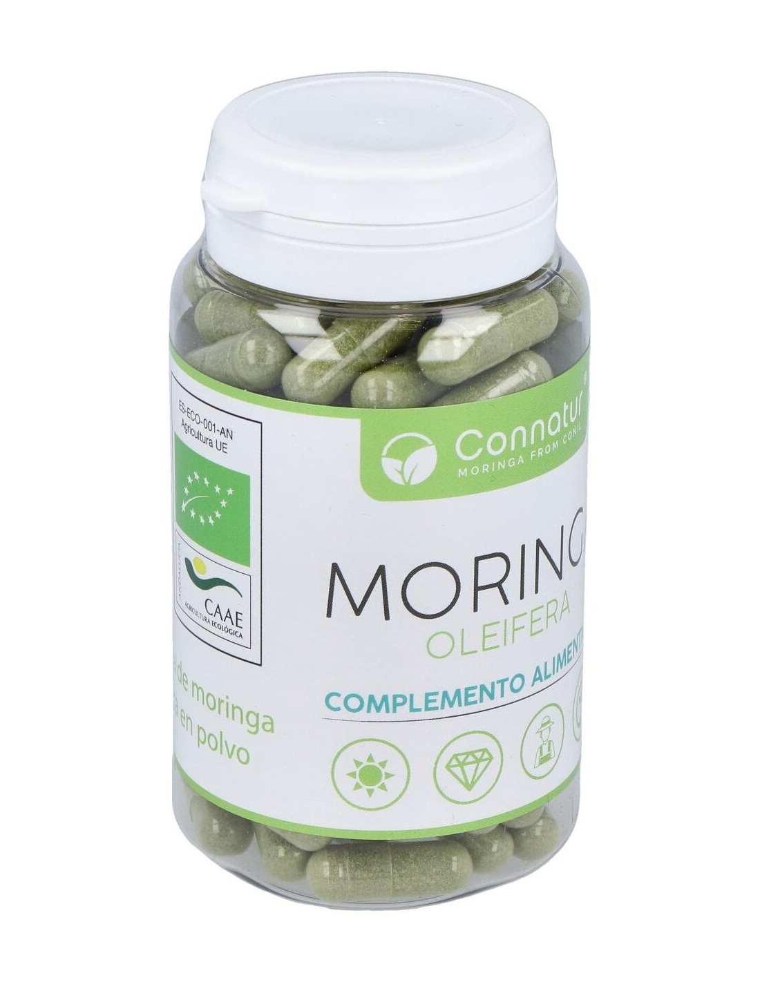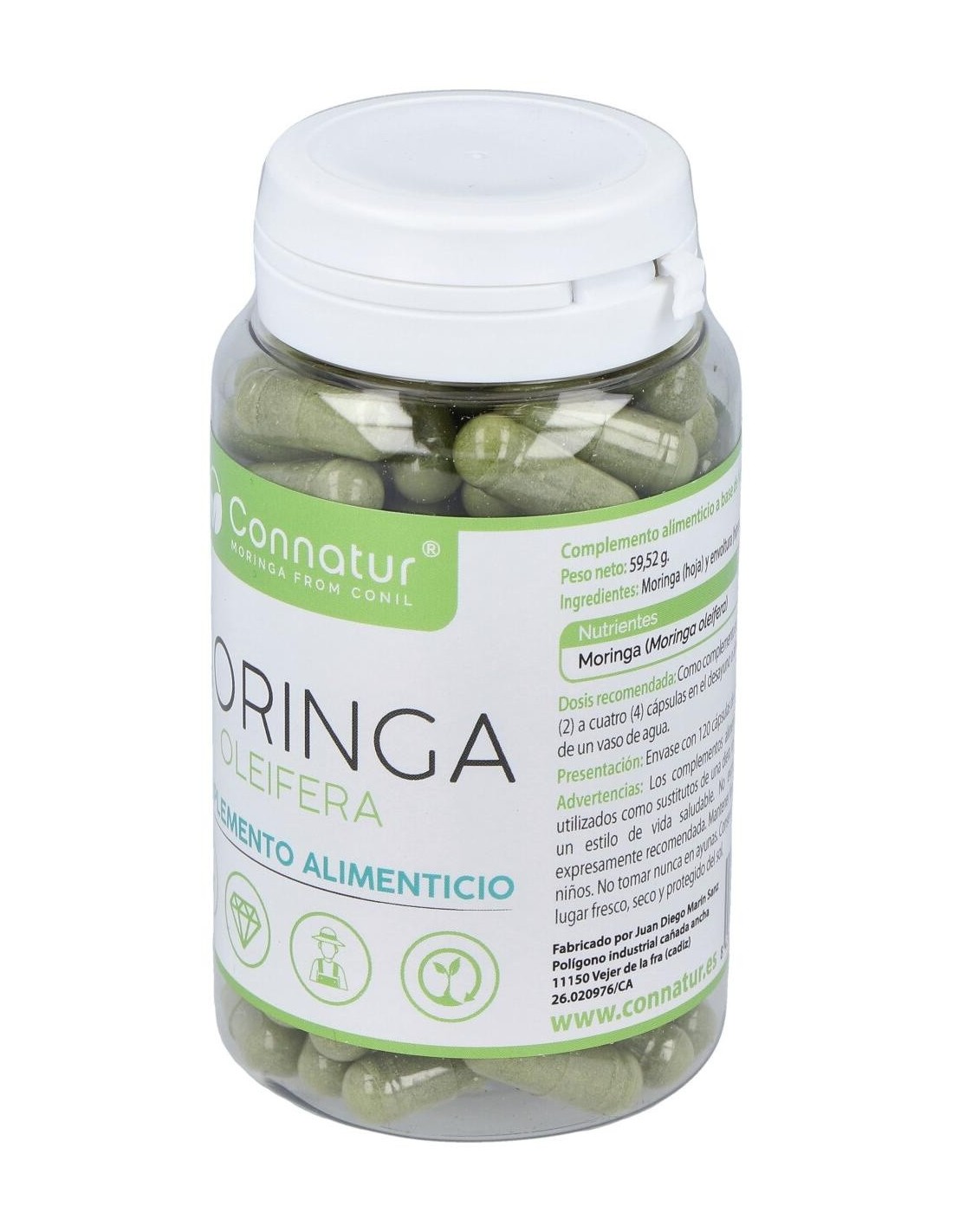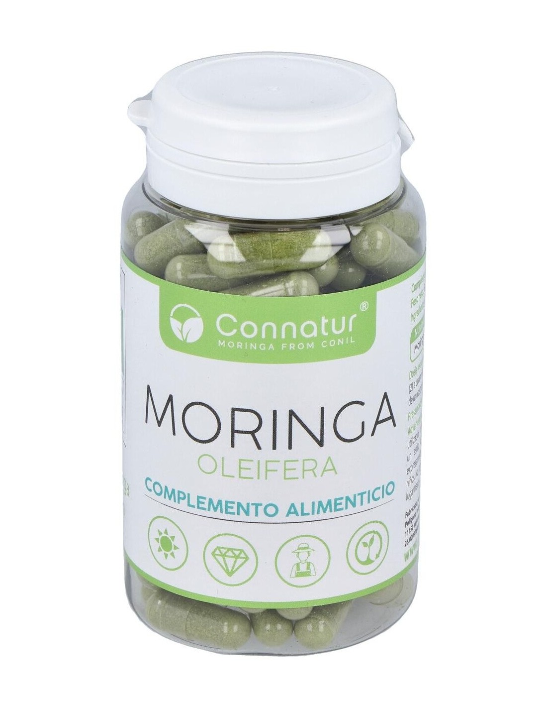Complemento alimenticio con extracto de moringa natural. La moringa tiene propiedades digestivas que favorecen un buen tránsito intestinal, posee minerales como calcio, cobre, potasio, hierro, magnesio y zinc. Ayuda a activar el metabolismo y a quemar grasas y favorece la recuperación del esfuerzo físico. Aporta carotenoides, quercetina, vitaminas A,C, E, K, B1, B2 y B6, polifenoles, ácido clorogénico, con efectos antioxidantes, antibacterianas, desintoxicantes y antiinflamatorios. Es un producto elaborado con ingredientes de cultivos ecológicos en Conil.