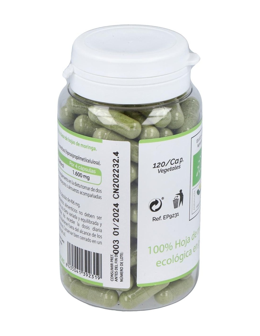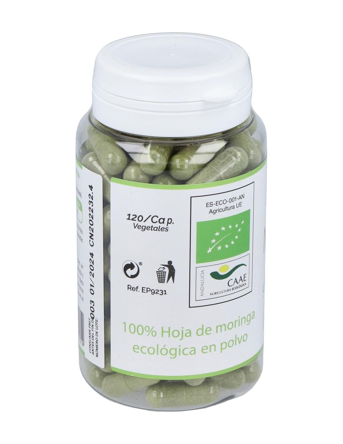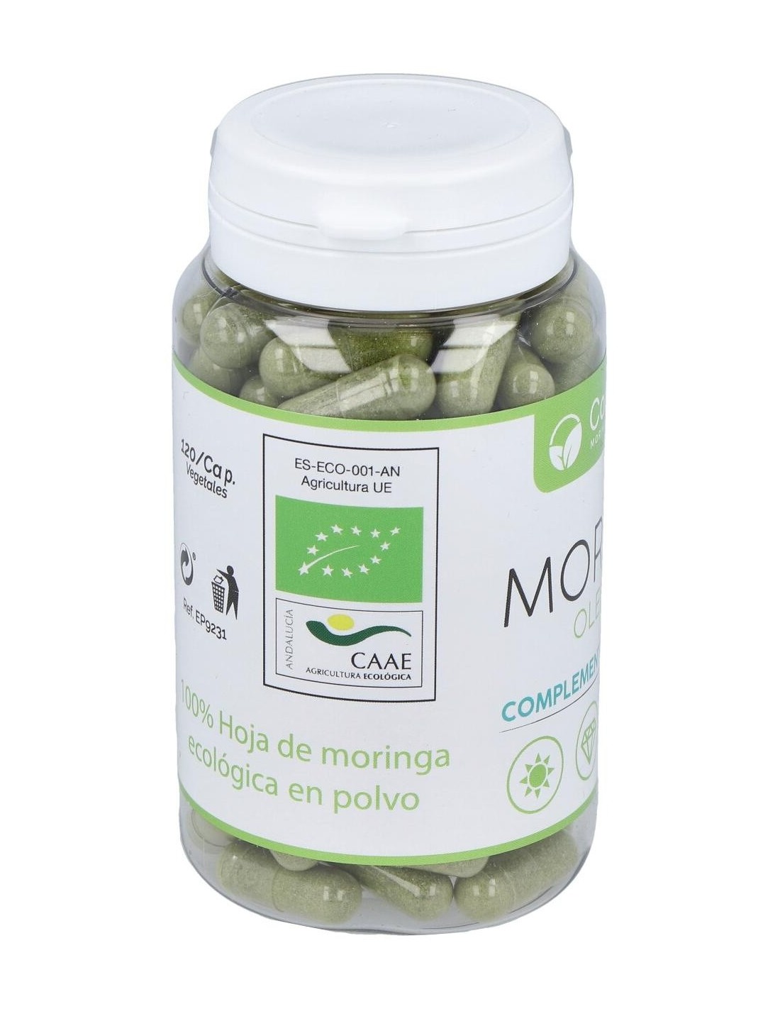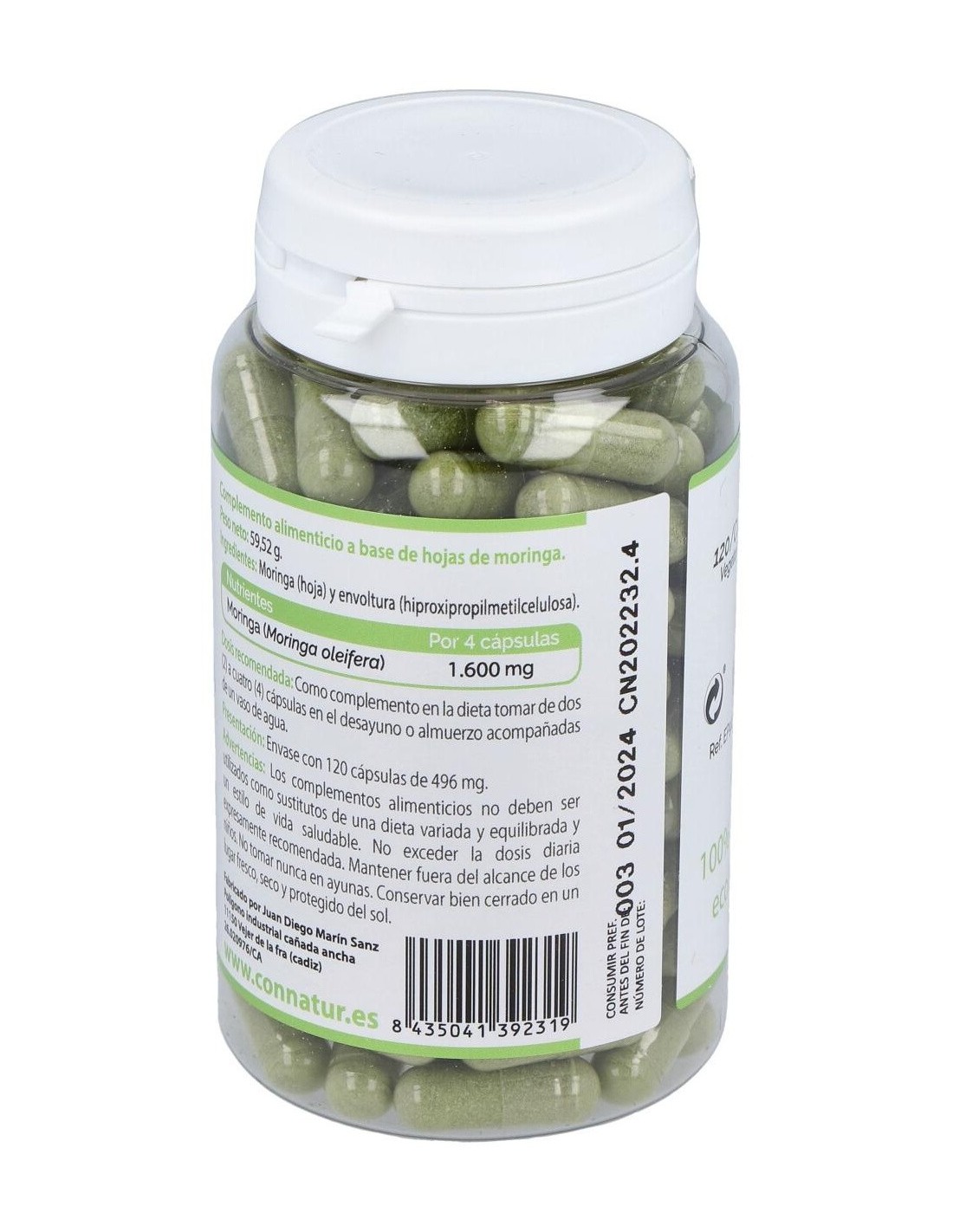 Complemento alimenticio con extracto de moringa natural. La moringa tiene propiedades digestivas que favorecen un buen tránsito intestinal, posee minerales como calcio, cobre, potasio, hierro, magnesio y zinc. Ayuda a activar el metabolismo y a quemar grasas y favorece la recuperación del esfuerzo físico. Aporta carotenoides, quercetina, vitaminas A,C, E, K, B1, B2 y B6, polifenoles, ácido clorogénico, con efectos antioxidantes, antibacterianas, desintoxicantes y antiinflamatorios. Es un producto elaborado con ingredientes de cultivos ecológicos en Conil.