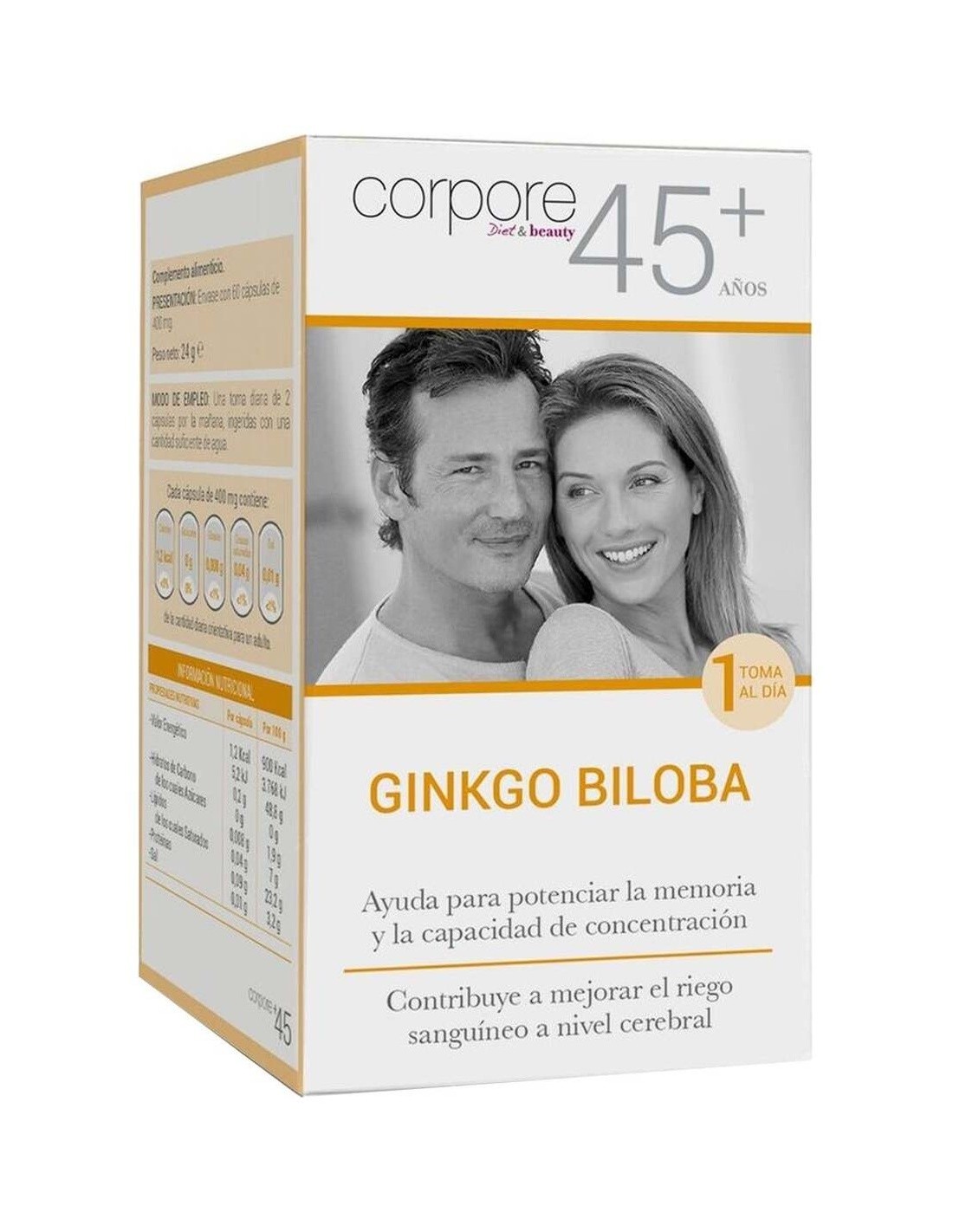 Corpore+45 Ginkgo Biloba 60caps es un complemento alimenticio a base de Ginkgo Biloba, un árbol con muchos fines terapéuticos que ayudan a aumentar la circulación sanguínea central y periférica y a la irrigación de los tejidos orgánicos. Además, también potencia la concentración y ayuda a tratar trastornos de memoria, dolor de cabeza y cambios de humor. Asimismo, también contribuye a aliviar los síntomas de la menopausia.