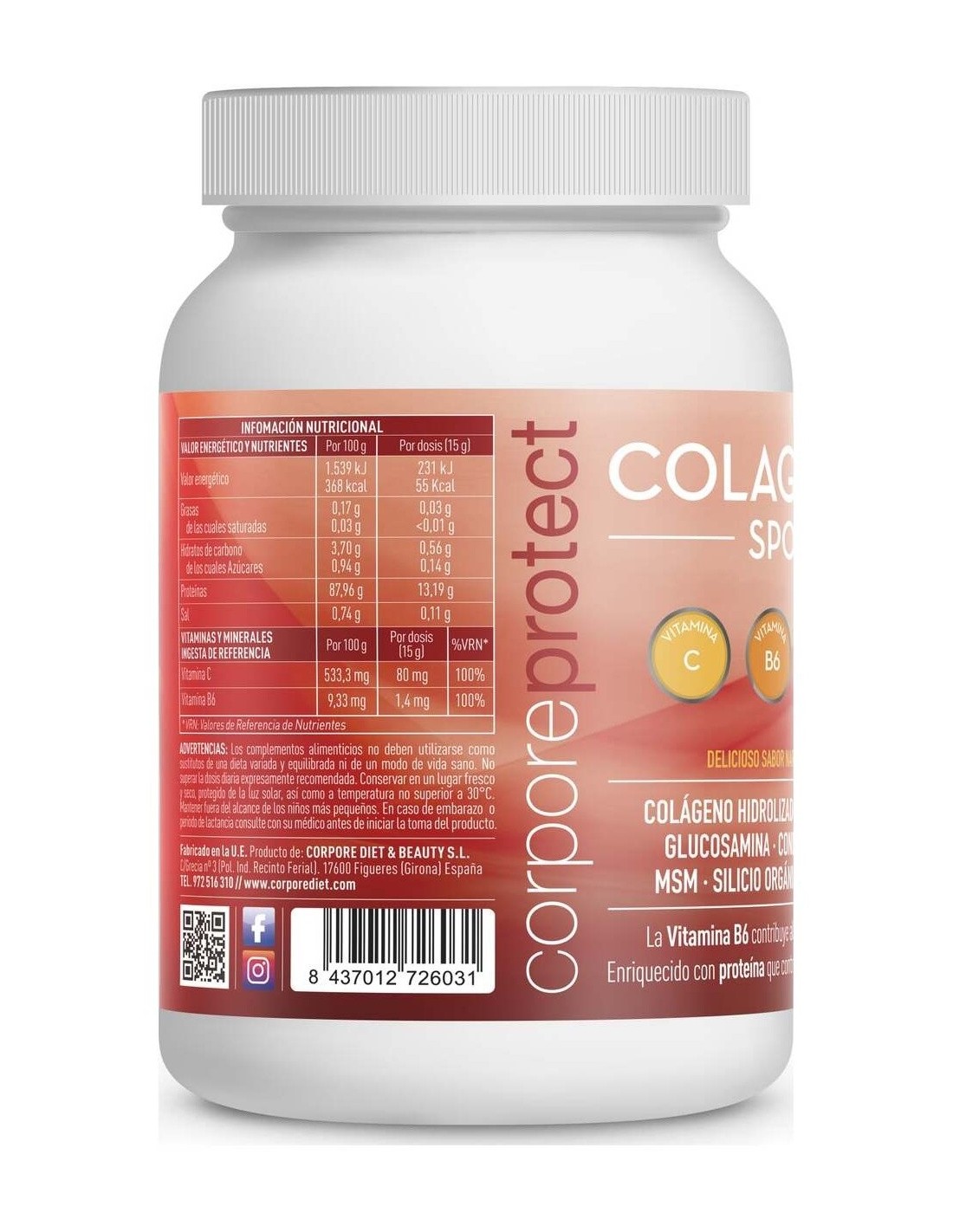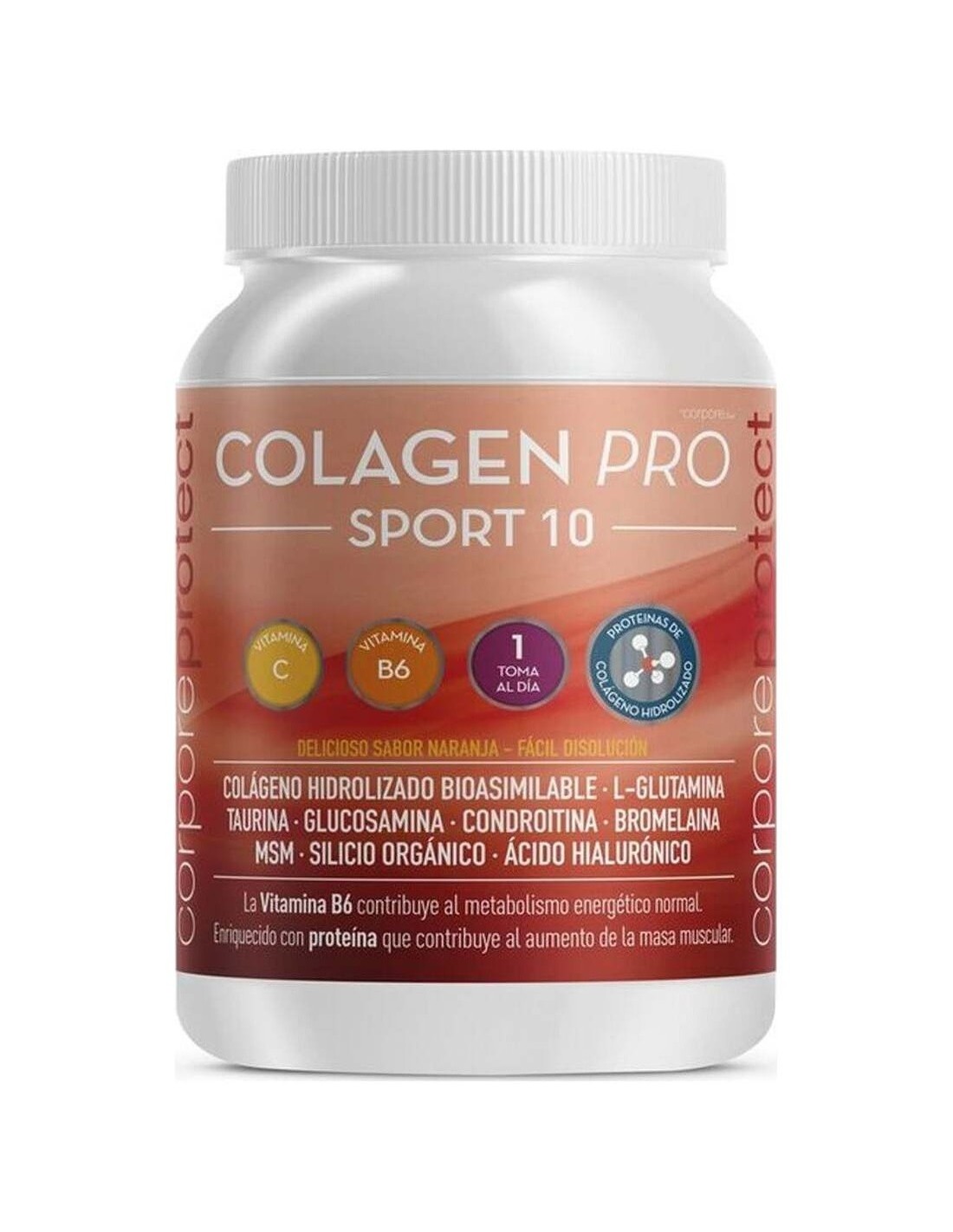Corpore Protect Colagen Pro - Sport 10 - 300g es un complemento de Colágeno ideal para deportistas, que ayuda a mantener el funcionamiento y la rápida recuperación de las articulaciones, ligamientos, cartílagos y tendones. Su fórmula es rica en MSM, que ayuda a mejorar la flexibilidad de las articulaciones, mejora la circulación y reduce los dolores e inflamaciones. Colagen Pro - Sport 10, también aporta Glucosamina y Bromelaína, que fomentan la reparación de daños en los cartílagos y la recuperación del tejido muscular. También aporta Vitamina C, Vitamina B6, Ácido Hialurónico, Condroitina y Silicio orgánico.