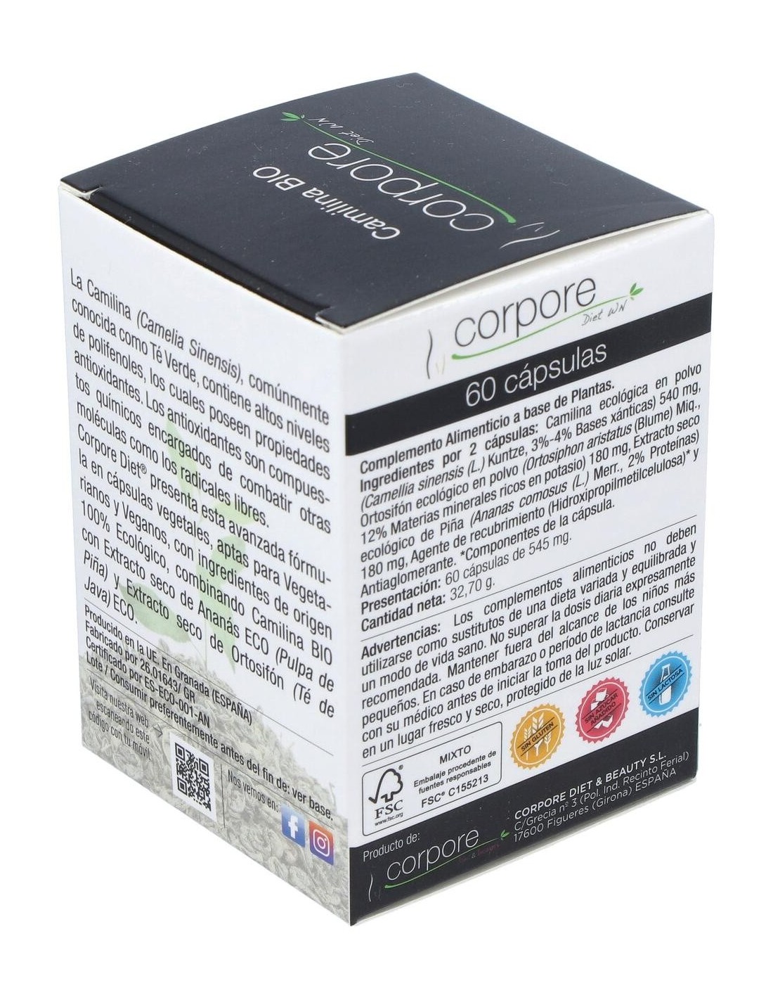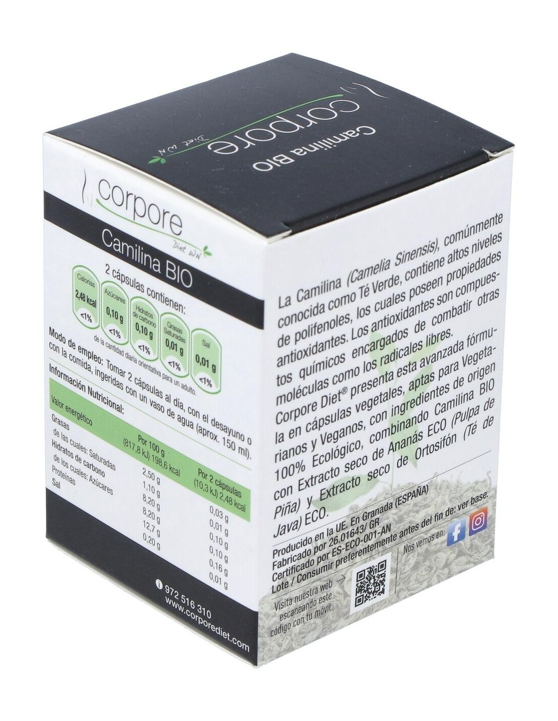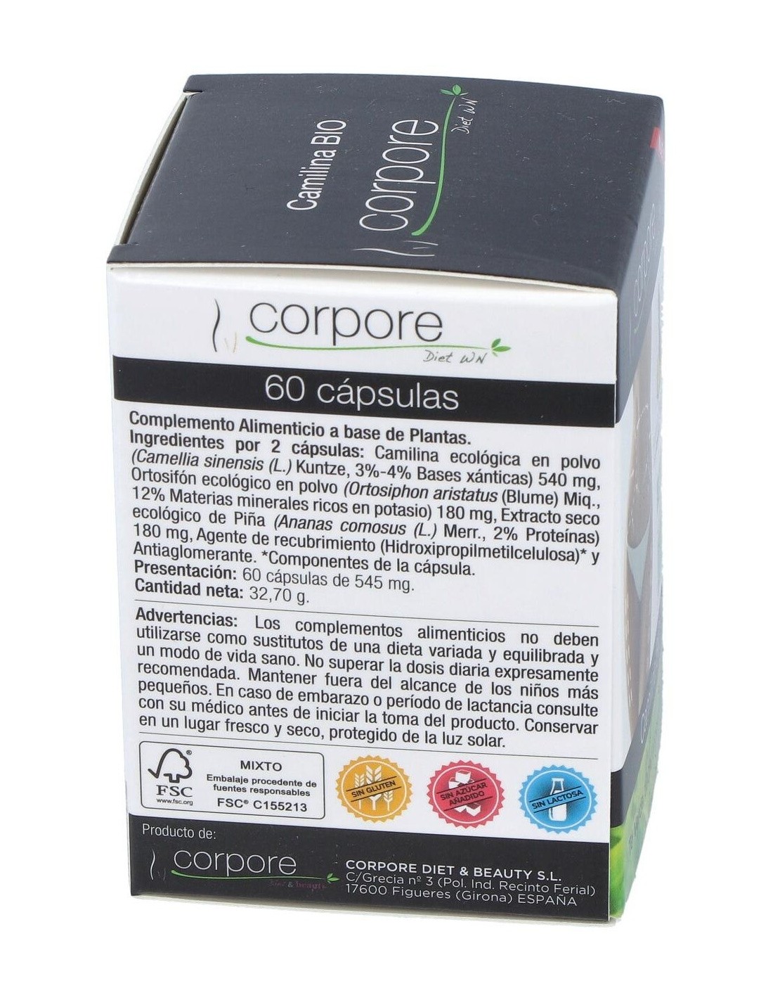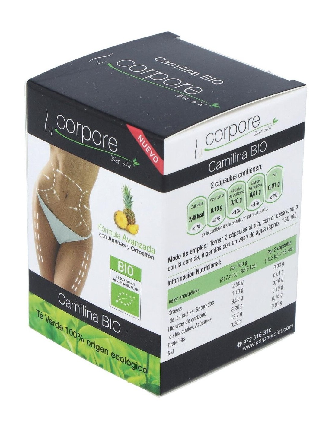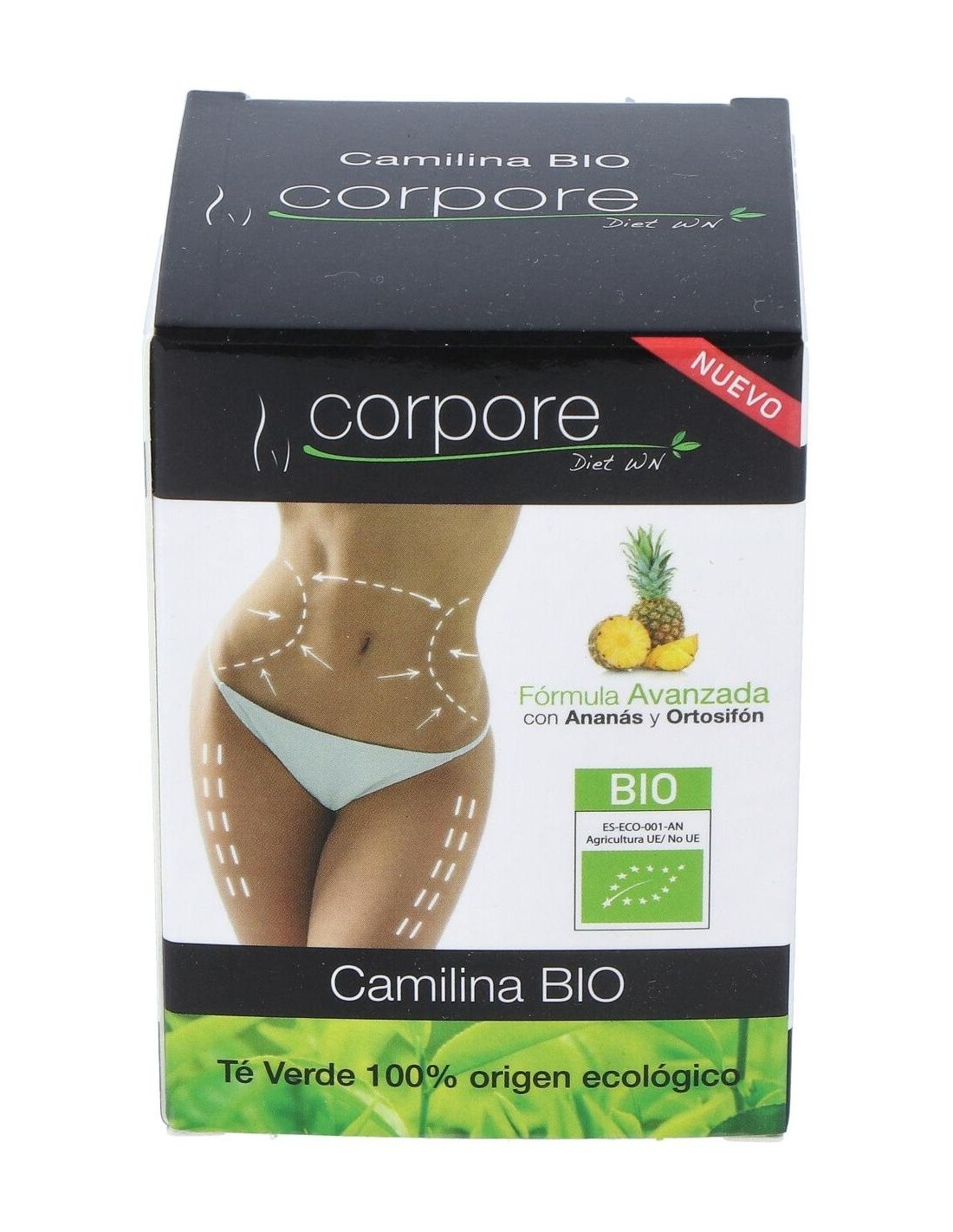 Esta exclusiva fórmula contiene ingredientes de origen 100% Ecológico, combinando Camilina BIO con Ananás BIO (Pulpa de Piña) y Extracto Seco de Ortosifón BIO (Té de Java). Presentada en cápsulas vegetales, aptas para Vegetarianos y Veganos, es un complemento ideal de ayuda para la pérdida de peso, y en especial para combatir la celulitis de las zonas más conflictivas de nuestro cuerpo como glúteos, vientre y muslos.