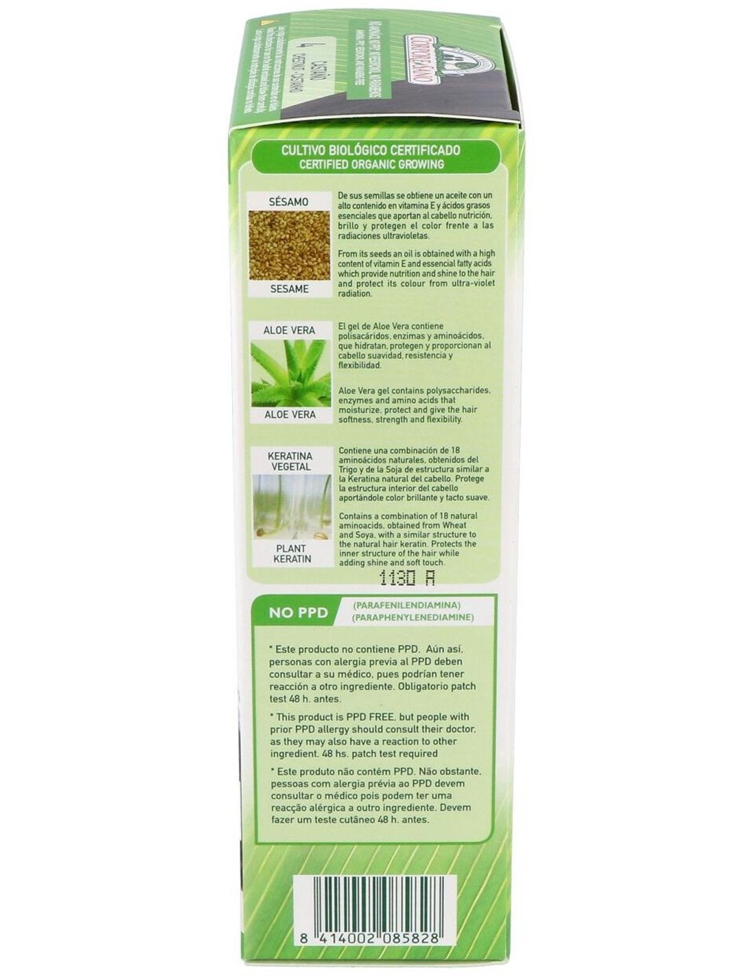 Cuida y mantiene el equilibrio natural del cuero cabelludo. Máxima cobertura de canas. Sin Amoníaco, PPD ni resorcinol. Su fórmula excluye ingredientes como el amoníaco, el resorcinol, la parafenilendiamina (PPD) y los conservantes parabenos. El aceite de semillas de Sésamo aporta al pelo nutrición y protección del color gracias a su alto contenido en vitamina E y ácidos grasos. El extracto de Girasol aporta brillo y protección al cabello. La Keratina Vegetal contiene una combinación de 18 aminoácidos naturales, obtenidos del Trigo y de la Soja de estructura similar a la keratina natural del cabello. Protege la estructura interior del cabello aportándole color brillante y tacto suave.