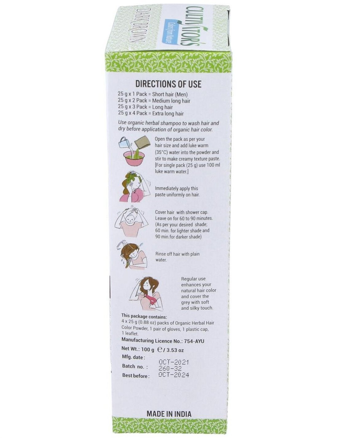 Lavar el cabello con un champú orgánico y secar antes de aplicar el tinte ecológico. Abrir el sobre o los sobres a utilizar según largo del pelo y volcar el contenido en un bol, agregar 100 ml de agua tibia (35ºC) por cada sobre. Mezclar hasta obtener una pasta homogénea. Aplicar de inmediato la pasta a tu cabello de manera uniforme. Cubrir todo el cabello con el gorro de plástico y dejar actuar el producto de 60 a 90 min según intensidad de color deseada (60 min para obtener un tono más claro y 90 min para la máxima intensidad de cada color). Aclarar muy bien el cabello con agua limpia.