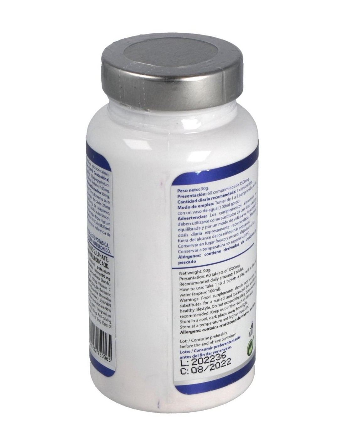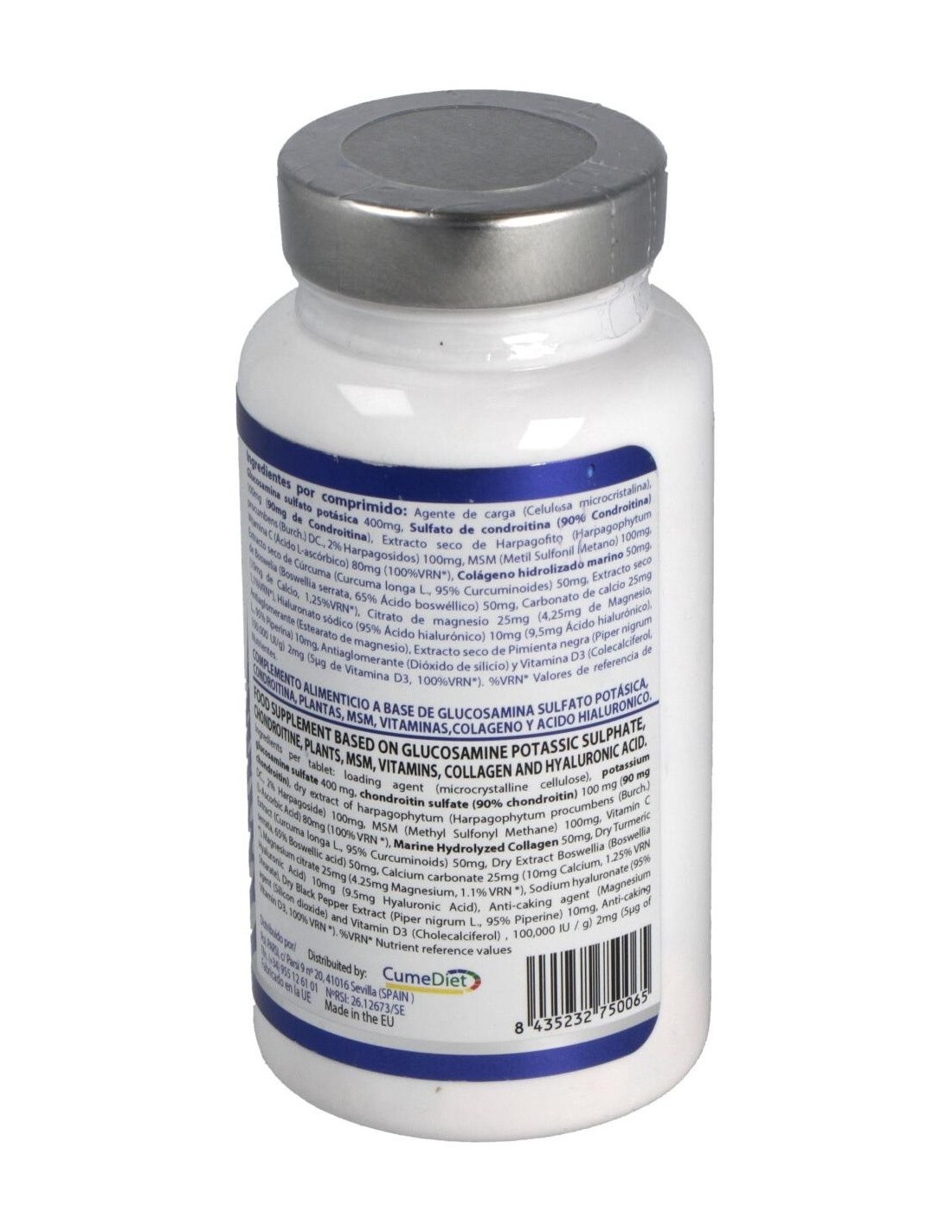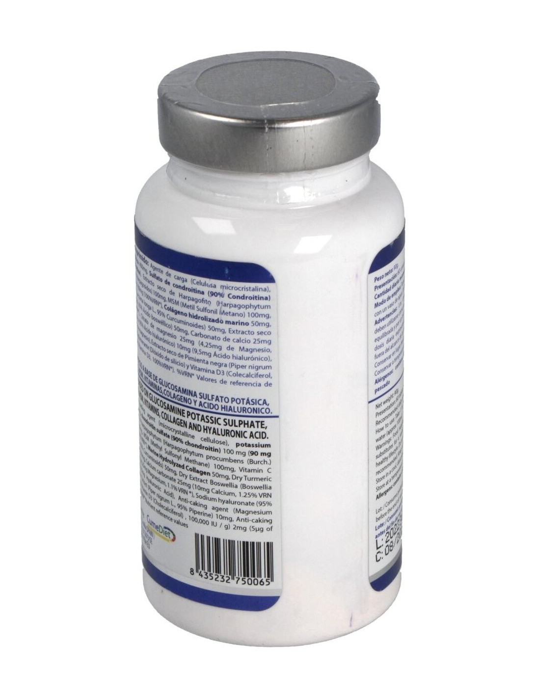 Agente de carga (Celulosa microcristalina), Glucosamina sulfato potásica 400mg, Sulfato de condroitina (90% Condroitina) 100m9 (90m9 de Condroitina), Extracto seco de Harpagofito (Harpagophytum procumbens (Burch.) DC., 2% Harpagosidos) 100 mg, MSM (Metil Sulfonil Metano) 100mg, Vitamina C (Ácido L-ascórbico) 80mg (100% VRN*), Colágeno hidrolizado marino 50 mg, Extracto seco de Cúrcuma (Curcuma tonga L., 95% Curcuminoides) 50 mg, Extracto seco de Boswellia (Boswellia serrata, 65% Ácido boswélico) 50 mg, Carbonato de calcio 25mg (10mg de Calcio, 1,25%VRN*), Citrato de magnesio 25mg (4,25mg de Magnesio, 1,1%VRN*), Hialuronato sódico (95% Ácido hialurónico) 10mg (9,5m9 Ácido hialurónico), Antiaglomerante (Estearato de magnesio), Extracto seco de Pimienta negra (Piper nigrum L., 95% Piperina) 10mg, Antiaglomerante (Dióxido de silicio) y Vitamina D3 (Colecalciferol, 100.000 UI/g) 2mg (5 mcg de Vitamina D3, 100%VRN*).