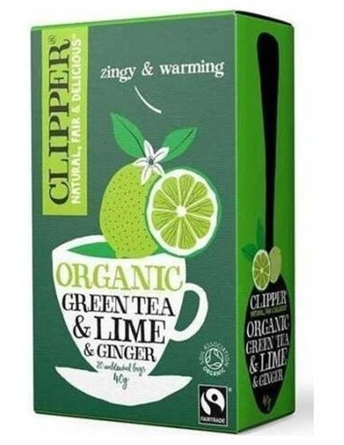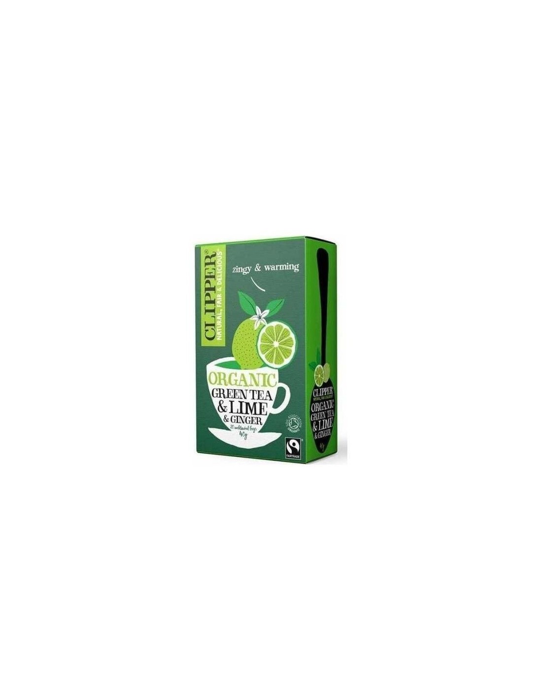 Té verde con lima y jengibre de cultivo ecológico presentado en envases de 20 bolsitos. Producto naturalmente libre de cafeína y proveniente de comercio justo.