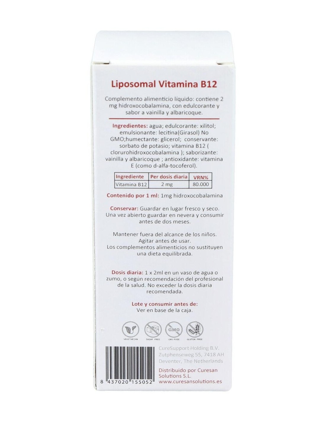 Hidroxocobalamina (B12): lecitina (girasol): conservante: sorbato de potasio: antioxidante: vitamina E (d-alfa tocoferol): xilitol: glicerol: agua: Aromatizante: albaricoque/ vainilla.