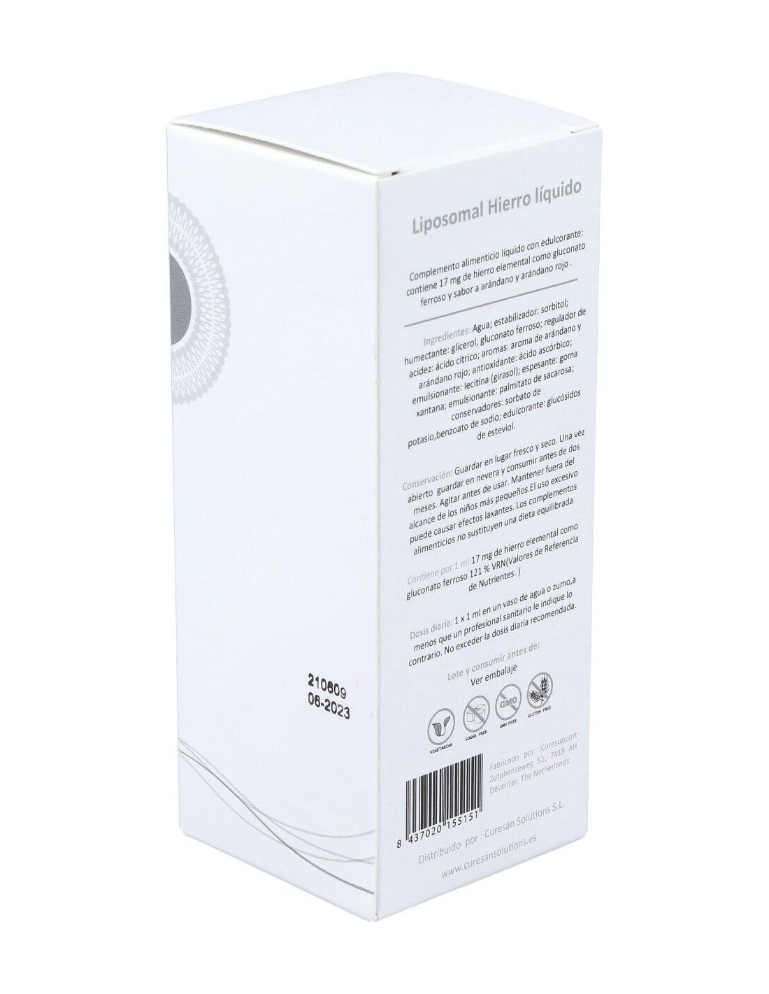 El hierro liposomado por su mecanismo de absorción no depende de los receptores intestinales para su absorción, mejorando la biodisponibilidad y la tolerabilidad del hierro. Sabor a arándanos.