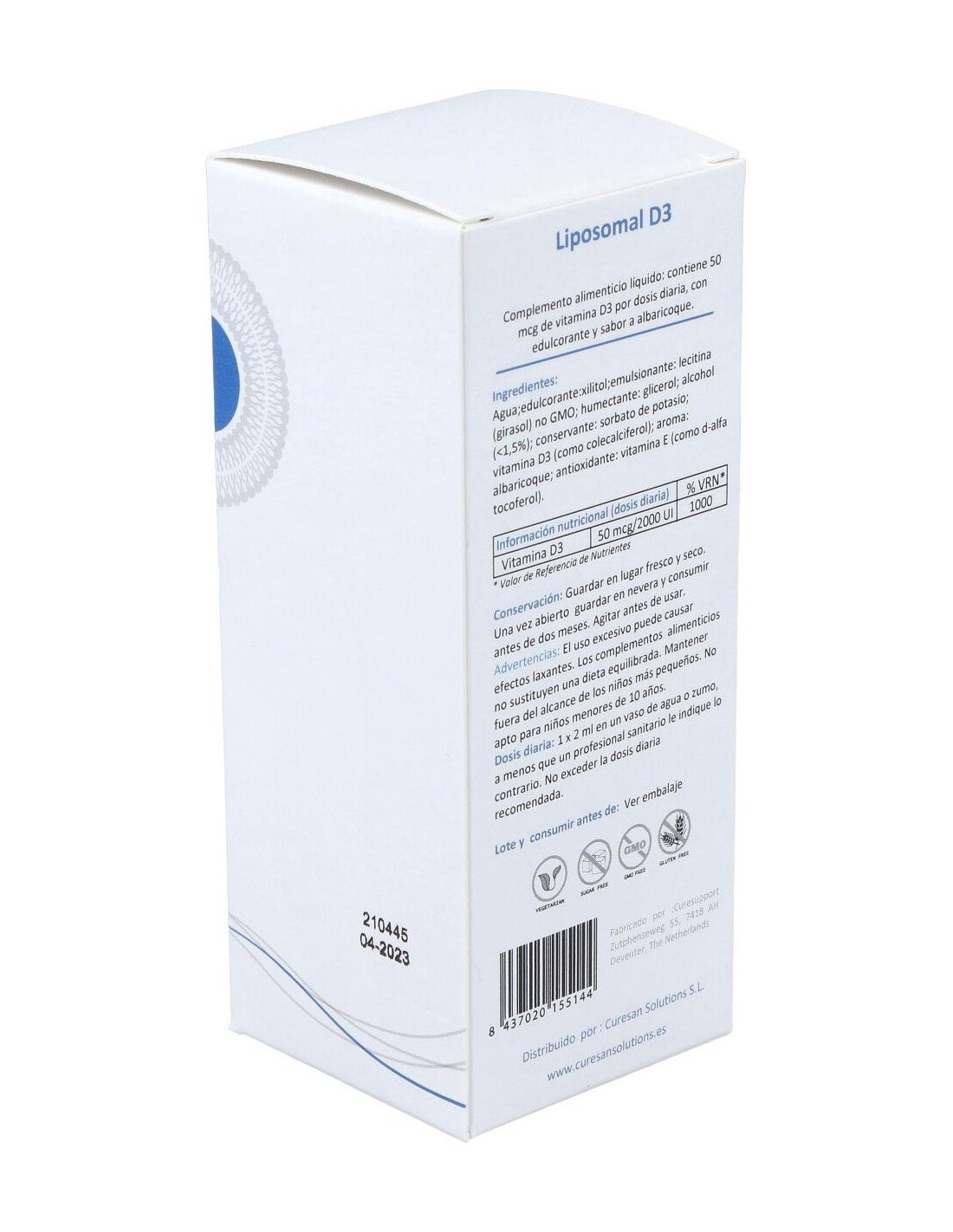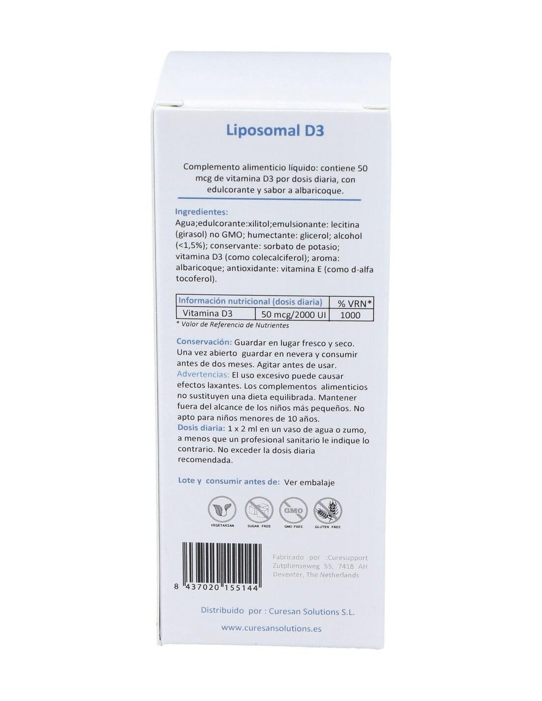 Agua: edulcorante: xilitol: emulsionante: lecitina (girasol) no GMO: humectante: glicerol: alcohol (<1,5%): conservante: sorbato de potasio: vitamina D3 (como colecalciferol): aroma: albaricoque: antioxidante: vitamina E (como d-alfa tocoferol).