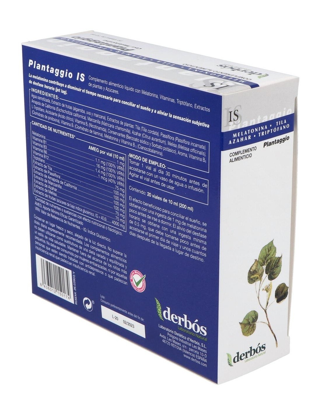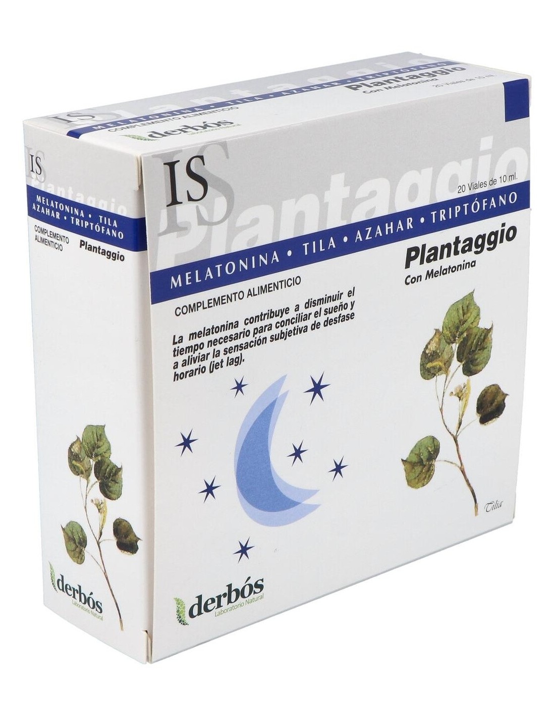 Derbos Plantaggio IS es un complemento alimenticio que ayuda a la relajación y a combatir el insomnio, favoreciendo el correcto descanso. Su fórmula contiene extractos fluidos de plantas con efecto relajante, vitaminas y l-triptófano.