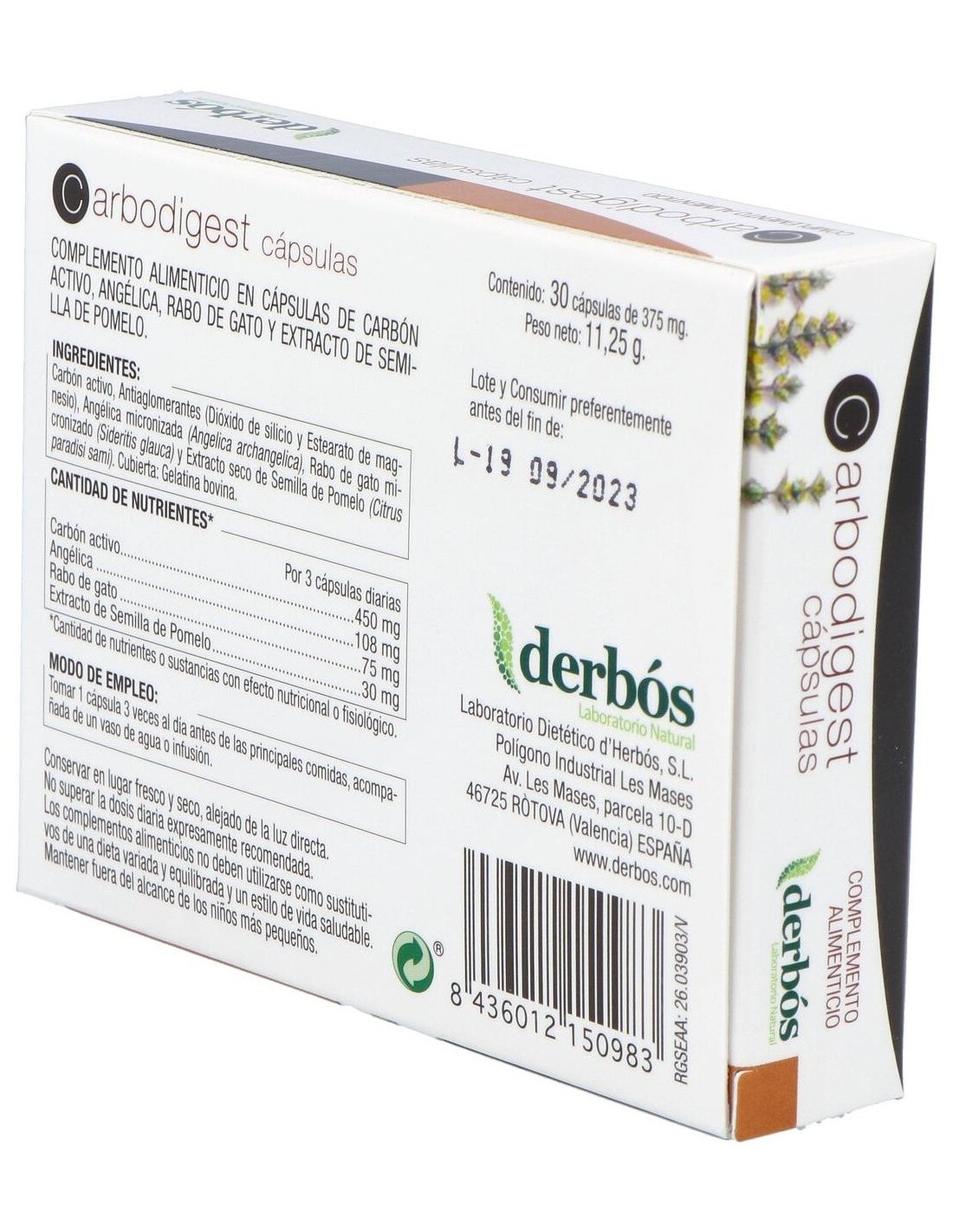 Carbón activo, Antiaglomerantes (Dióxido de silicio y Estearato de magnesio), Angélica micronizada (Angelica archangelica), Rabo de gato micronizado (Sideritis glauca), Extracto seco de Semilla de Pomelo (Citrus paradisi sami), Cubierta: Gelatina de origen bovino.