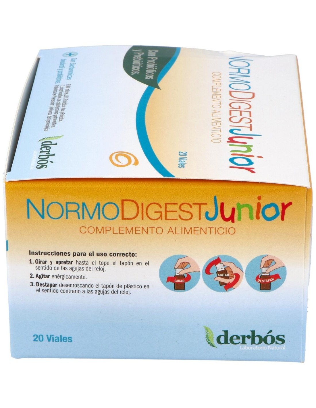 Derbos Normodigest Junior es un complemento alimenticio ayuda a activar la flora intestinal. Su fórmula con cepas bioactivas de bifidus y lactobacilos contribuye a la mejora de la asimilación de los alimentos y al refuerzo del sistema inmunitario.