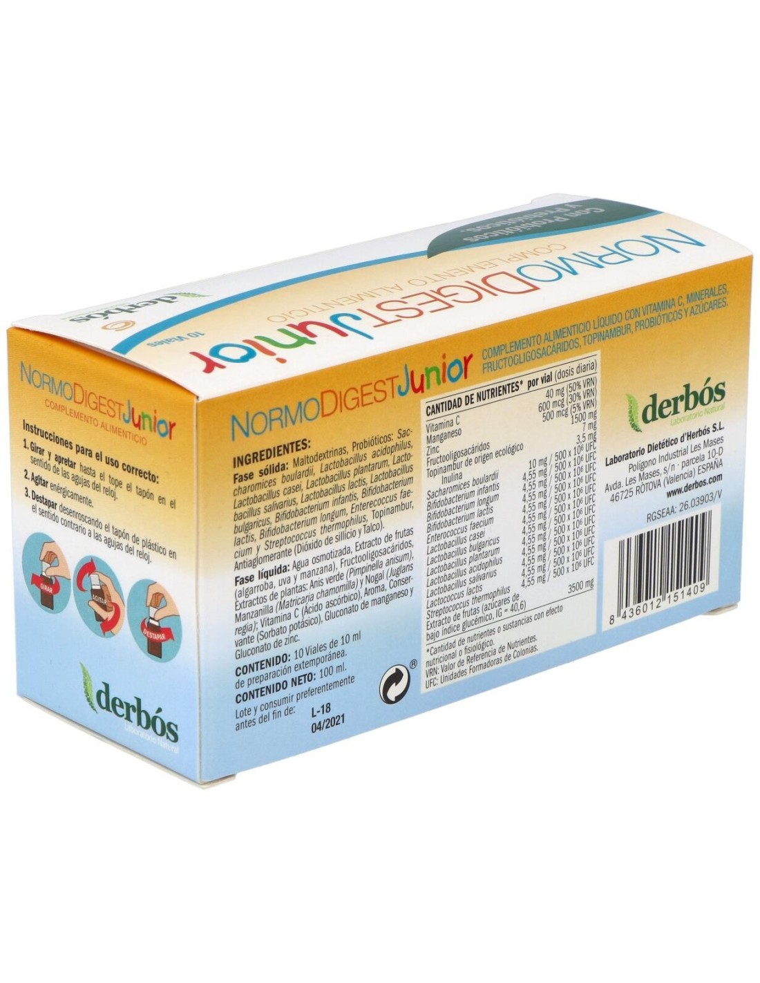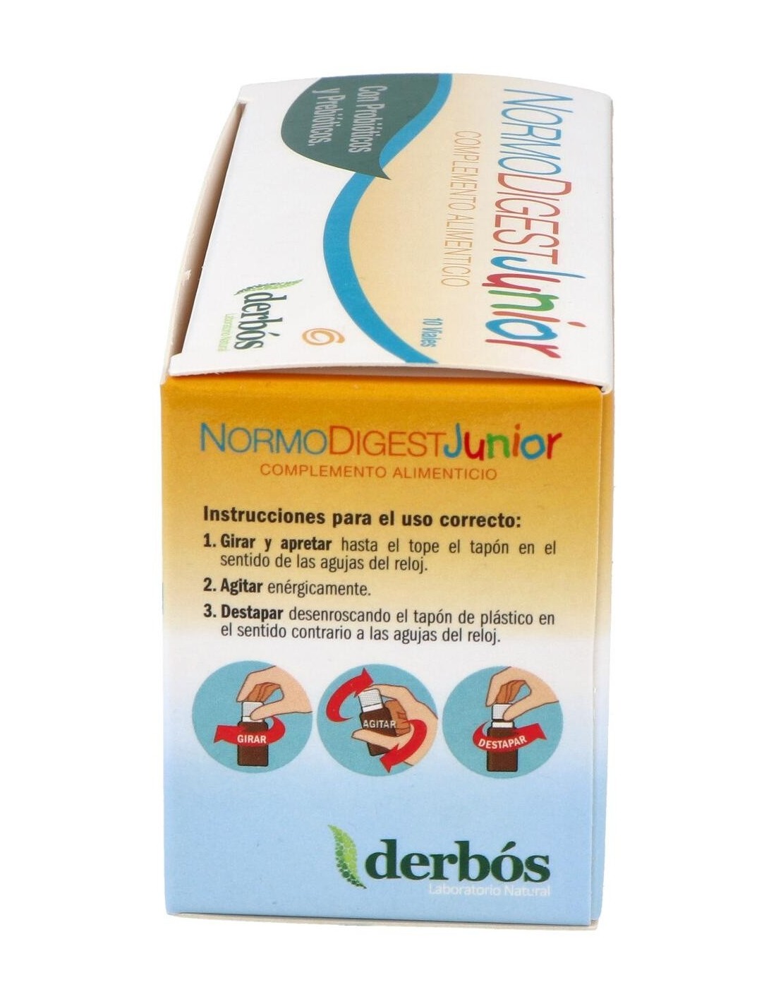 Derbos Normodigest Junior es un complemento alimenticio ayuda a activar la flora intestinal. Su fórmula con cepas bioactivas de bifidus y lactobacilos contribuye a la mejora de la asimilación de los alimentos y al refuerzo del sistema inmunitario.