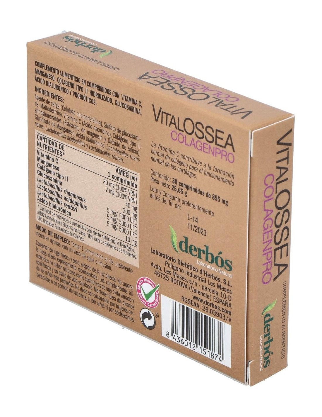 Complemento alimenticio en comprimidos con vitamina C, manganeso, colágeno tipo II, glucosamina, ácido hialurónico y probióticos. La vitamina C contribuye a la formación normal de colágeno para aelfuncionamiento normal de los cartílagos.