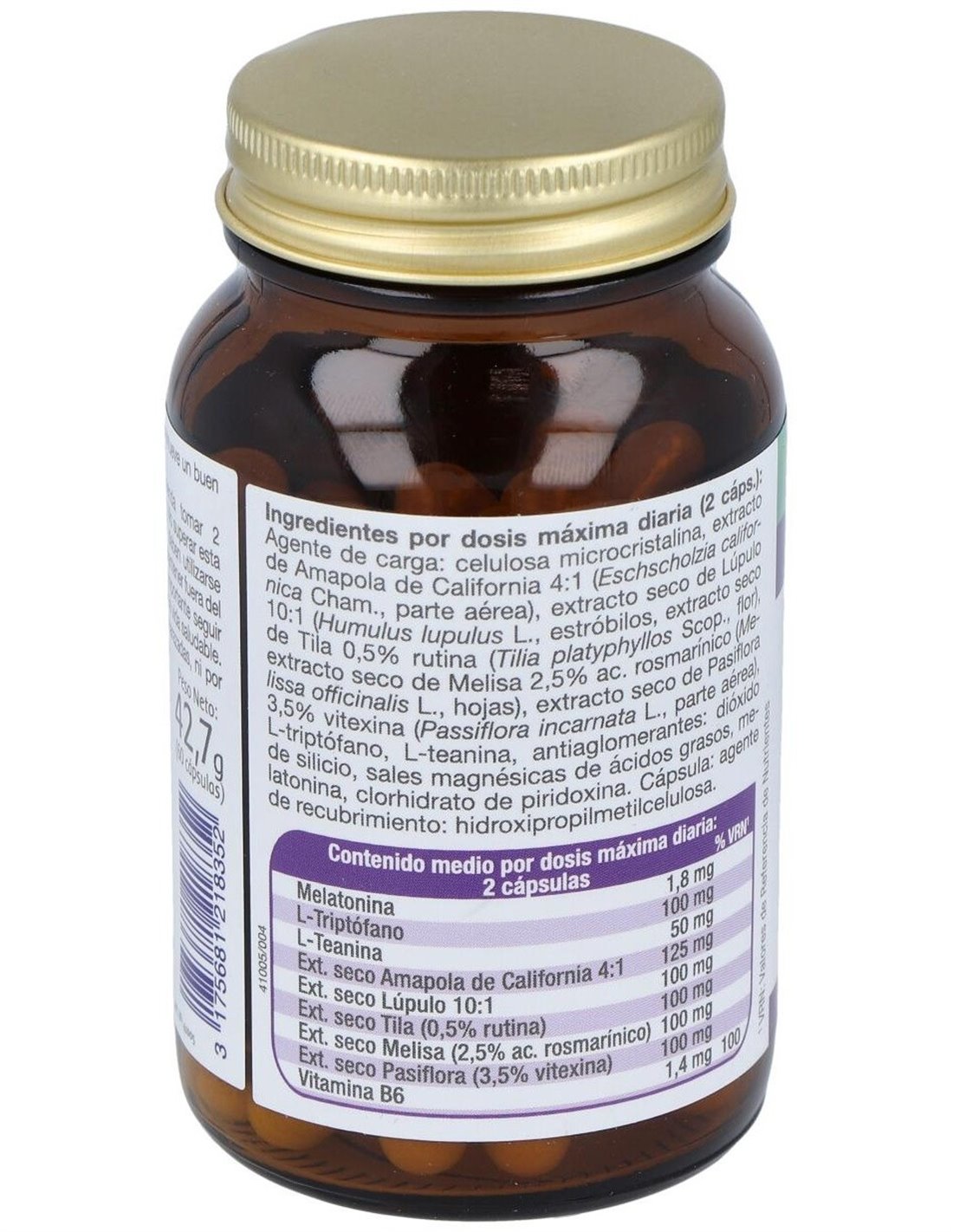 Complemento alimenticio indicado para ayudar a conciliar el sueño y descansar. Elaborado con ingredientes activos, contiene melatonina que ayuda a inducir el sueño y relajar el cuerpo, l.triptófano un aminoácido esencial que favorece la producción natural de melatonina. Con l-teanina extraído del té verde, pasiflora, lúpulo, amapola de California, melisa y vitamina B6. Sin lactosa, gluten ni ingredientes de origen animal.