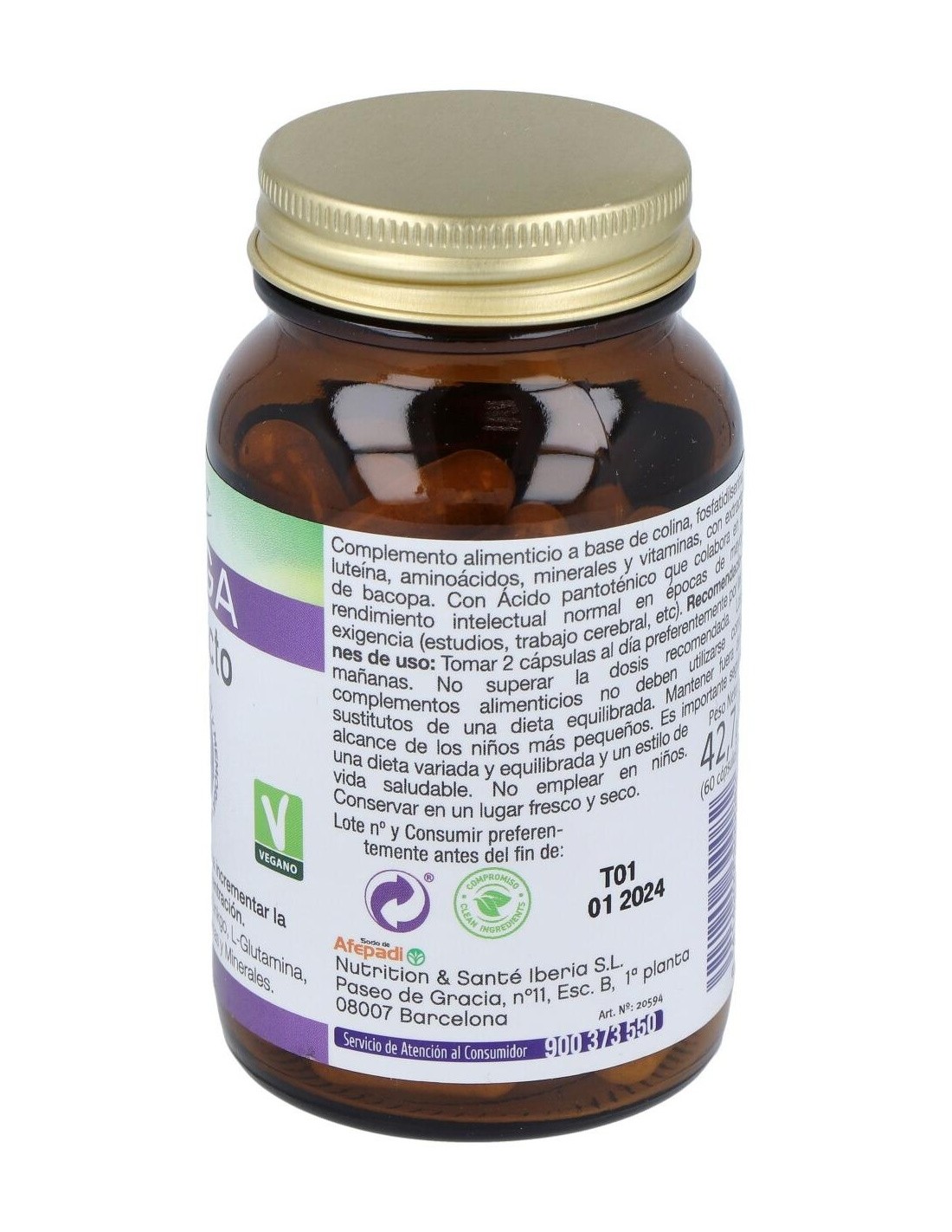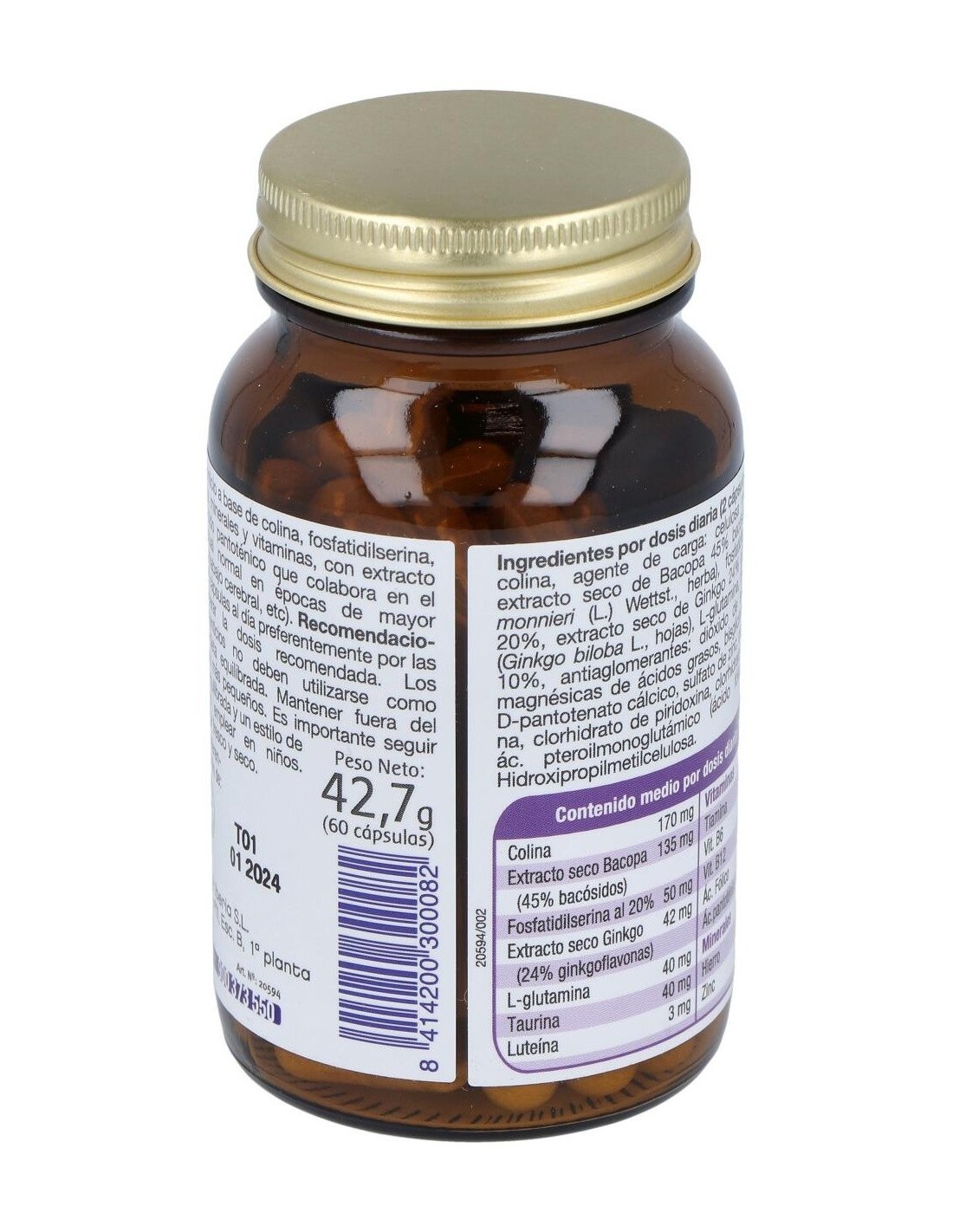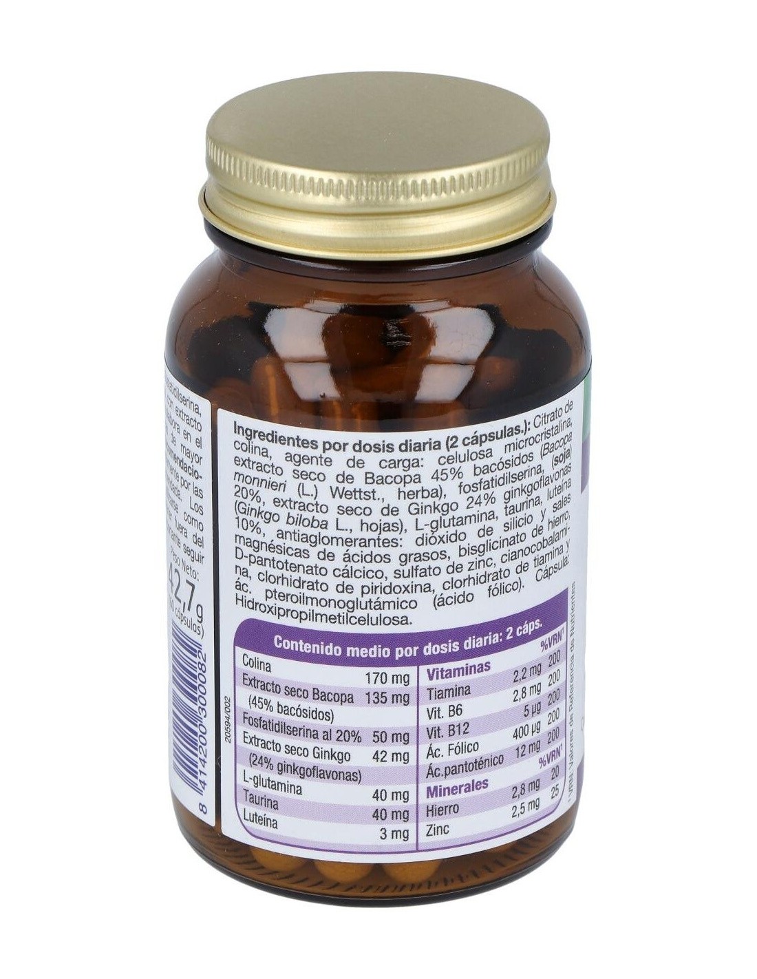 Citrato de colina, agente de carga: celulosa microcristalina, extracto seco de Bacopa 45% bacósidos (Bacopa monnieri (L.) Wettst., herba), fosfatidilserina, (soja)20%, extracto seco de Ginkgo 24% ginkgoflavonas (Ginkgo biloba L., hojas), L-glutamina, taurina, luteína 10%, antiaglomerantes: dióxido de silicio y sales magnésicas de ácidos grasos, bisglicinato de hierro, Dpantotenato cálcico, sulfato de zinc, cianocobalamina, clorhidrato de piridoxina, clorhidrato de tiamina y ác. pteroilmonoglutámico (ácido fólico). Cápsula: Hidroxipropilmetilcelulosa.