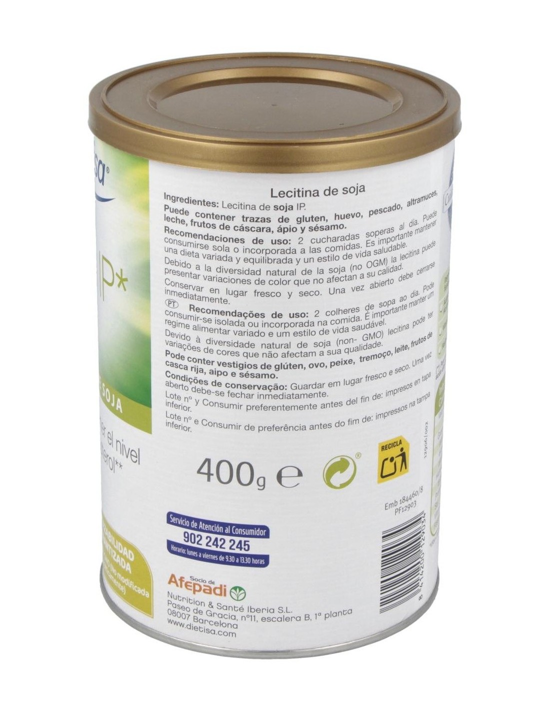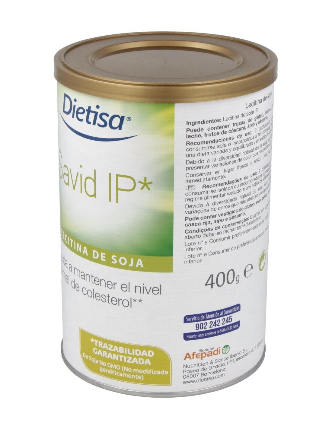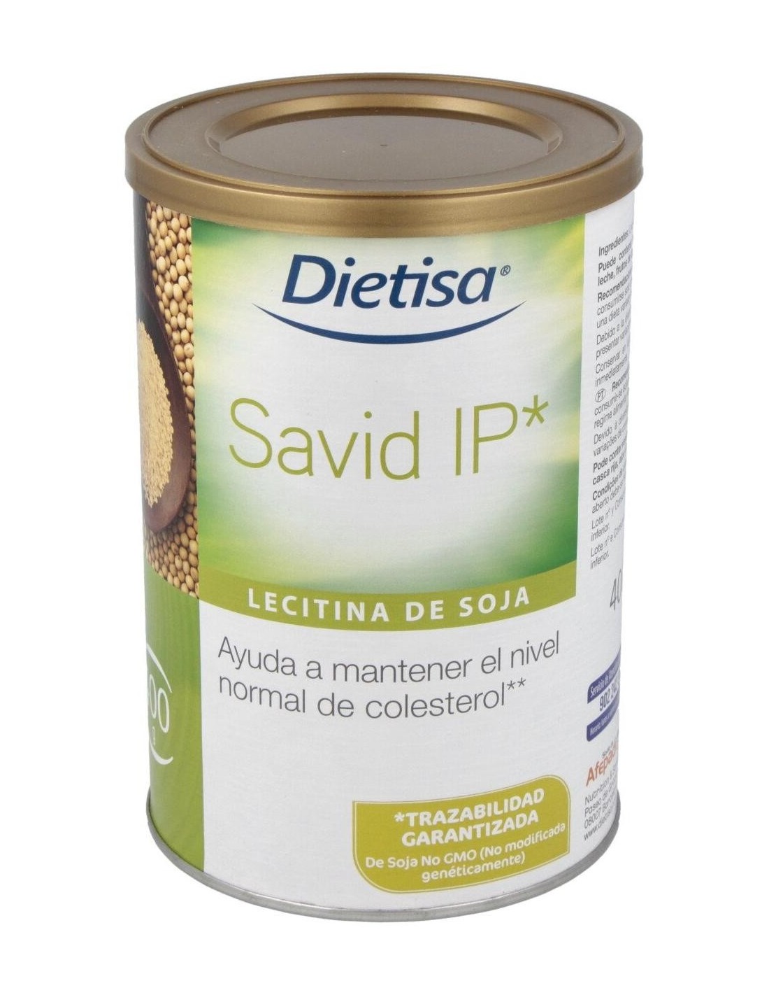Dietisa Savid Ip Lecitina De Soja 400g es un complemento alimenticio a base de lecitina de soja que contribuye a mantener niveles normales de colesterol. Savid IP (Identidad preservada) es una mezcla natural de fosfolípidos que ofrece la máxima calidad y homogeneidad, además de trazabilidad garantizada, pues este producto asegura que no contiene organismos modificados genéticamente (OMG/GMO) de ningún tipo y en todos los procesos, desde el cultivo y las semillas hasta la completa elaboración del producto.