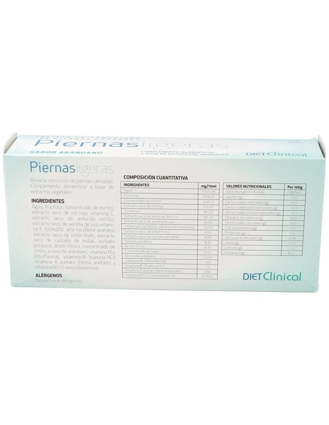 Agua, fructosa, concentrado de mirtilo, extracto seco de vid roja, vitamina C, extracto seco de antocian mirtilo, extracto seco de semilla de uva, vitamina E (50%)(DL alfa tocoferol acetato) extracto seco de limón fruto, extracto seco de castaño de Indias, sorbato potásico, ácido cítrico, concentrado de limón, aroma de arándano, vitamina B12 (riboflavina), vitamina B1 (tiamina HCI) vitamina A acetato (retinil acetato) y vitamina B12 (cianocobalamina).