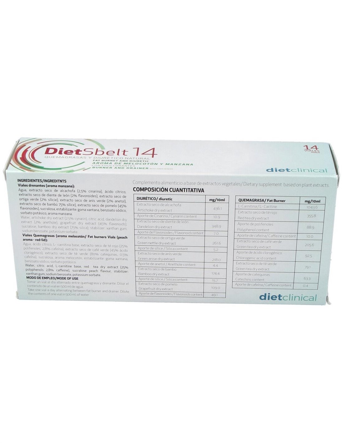 Viales quemagrasas (aroma melocotón): Agua, ácido cítrico, L- carnitina base, extracto seco de té rojo (25% polifenoles, 2,8% cafeína), extracto seco de café verde (45% ácido clorogénico), extracto seco de té verde (80% catequinas, 0,5% cafeína), sucralosa, aroma melocotón, estabilizante, benzoato sódico, sorbato potásico.