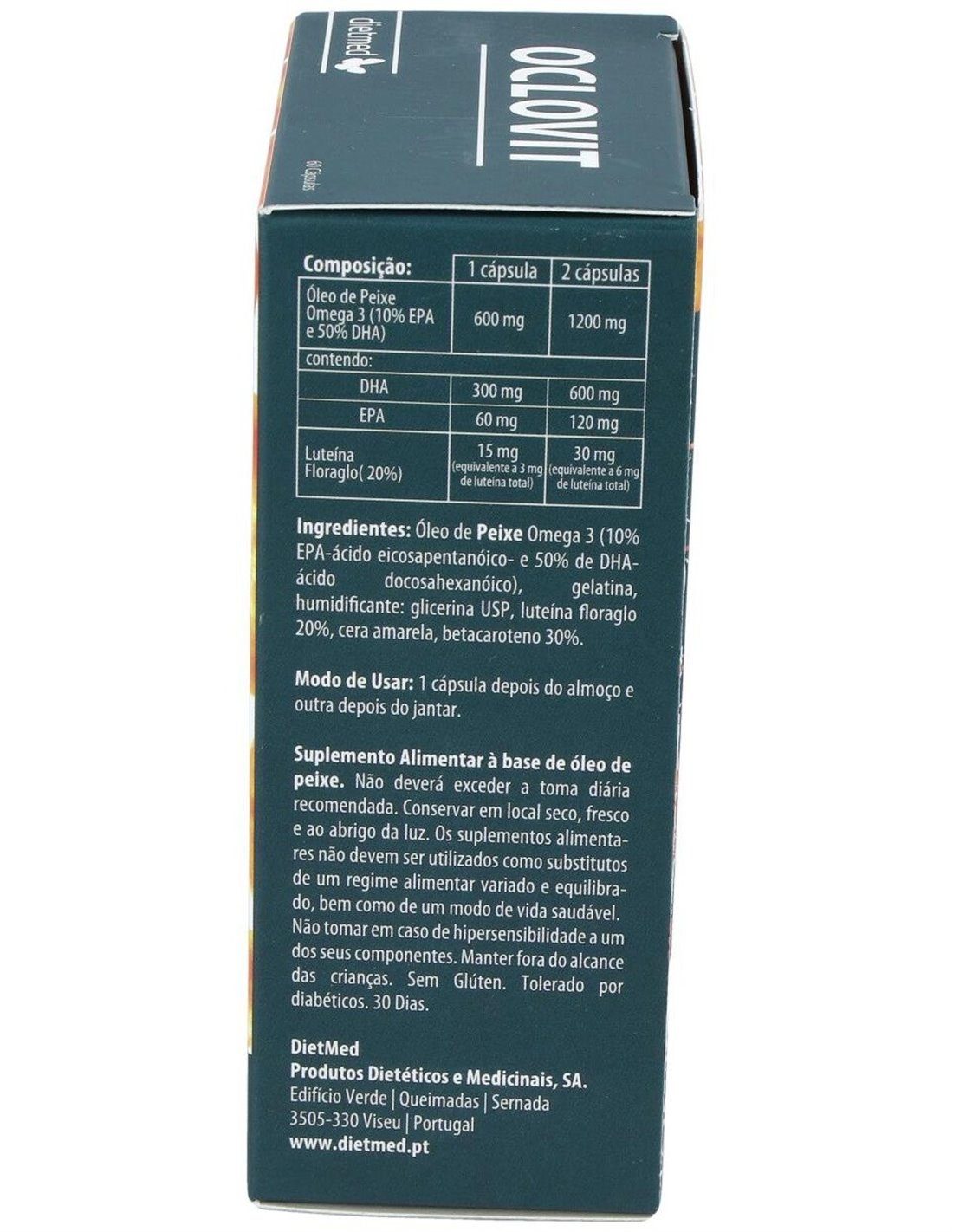 Complemento alimenticio formulado a base de aceite de pescado rico en EPA, DHA y luteína. Favorece el mantenimiento del sistema ocular en condiciones normales. Sus ingredientes tienen propiedades antioxidantes. Indicado para adultos.