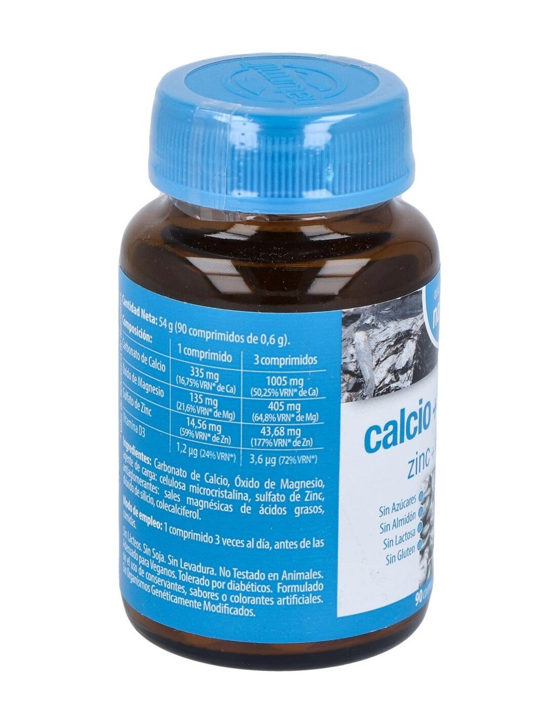 3 comprimidos: Carbonato de Calcio 1005 mg (50,25% VRN* de Ca), Óxido de Magnesio 405 mg (64,8% VRN* de Mg), Sulfato de Zinc 43,68 mg (177% VRN* de Zn), Vitamina D3 3,6 µg (72% VRN*).