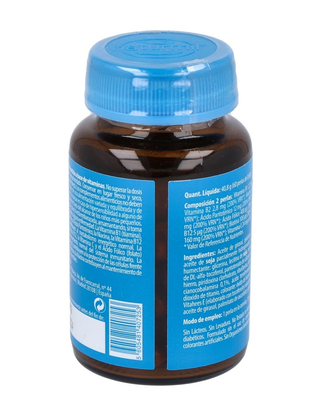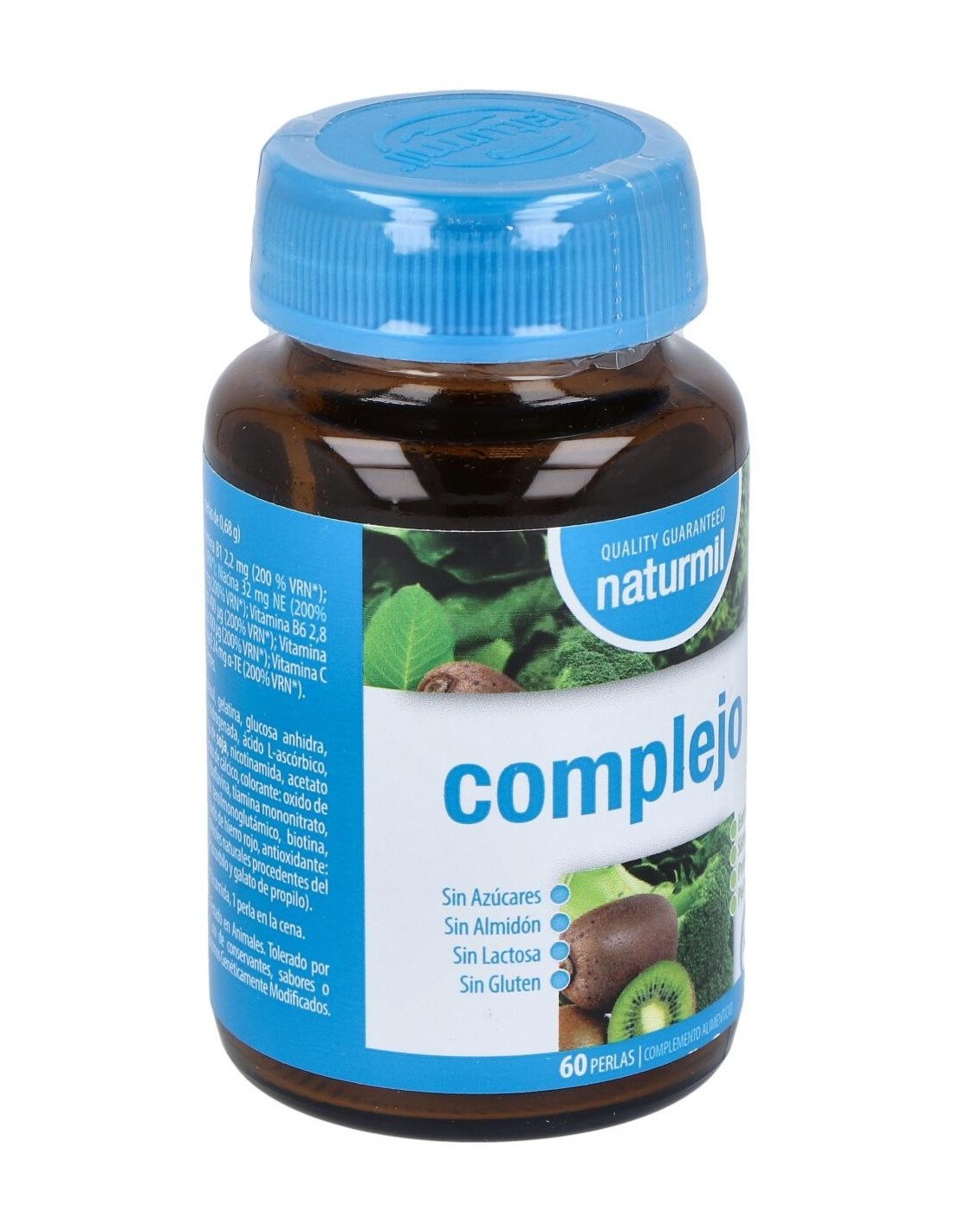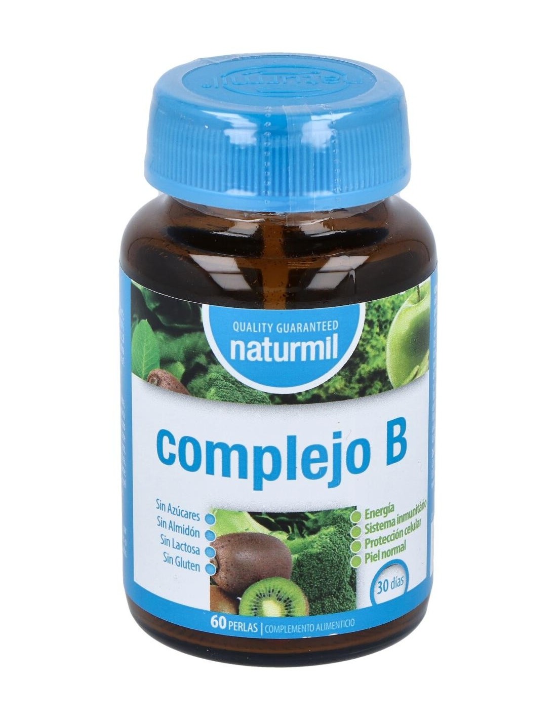 Complemento alimenticio Complejo B de Naturmil, formulado con vitamina B1 (tiamina), vitamina B6, biotina, ácido pantoténico, niacina, vitamina B12 vitamina C y ácido fólico que contribuyen al productor normal de metabolismo de la energía, y a la función normal del sistema inmune. También contiene vitamina E que contribuye a la protección de las células contra la oxidación indeseable.Sin azúcar. Sin almidón. Sin lactosa. Sin gluten.