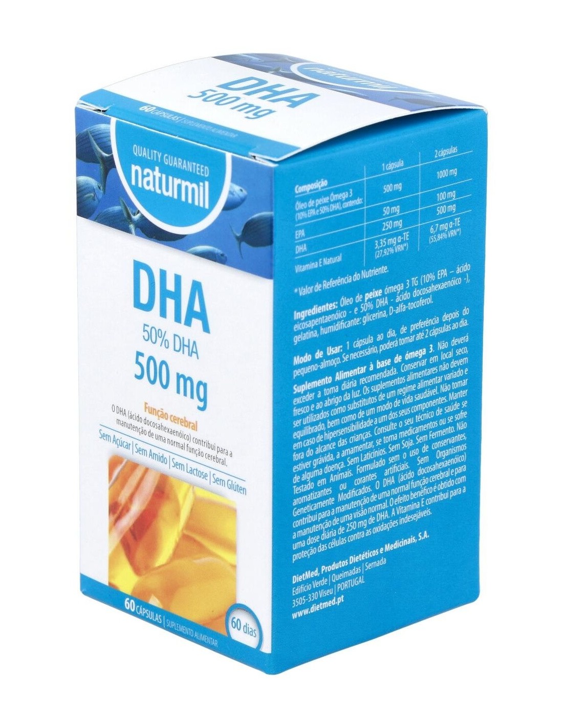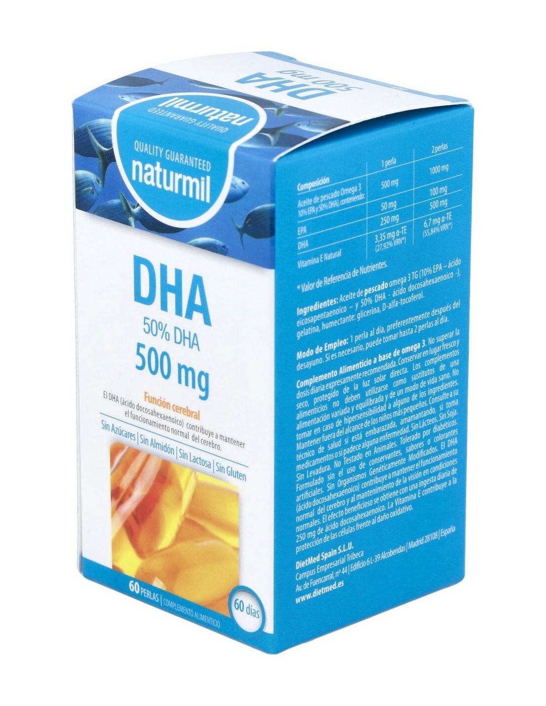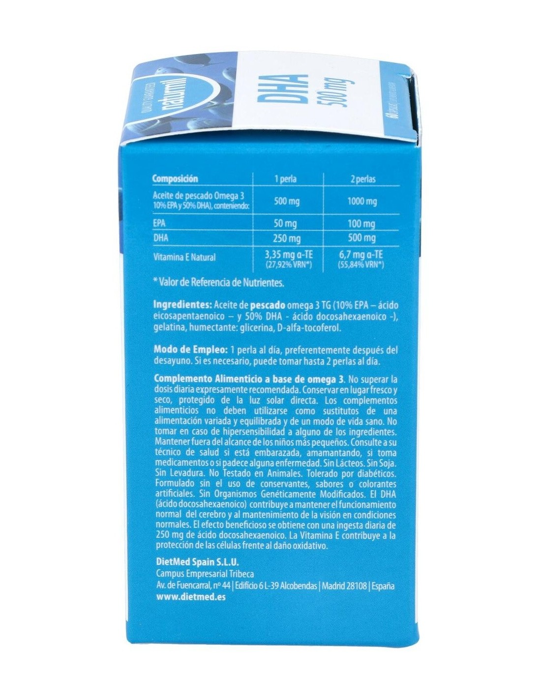 Aceite de pescado Omega 3 500 mg (10% EPA y 50% DHA), conteniendo: EPA 50 mg, DHA 250 mg, Vitamina E Natural 3,35 mg a-TE (27,92% VRN*).
