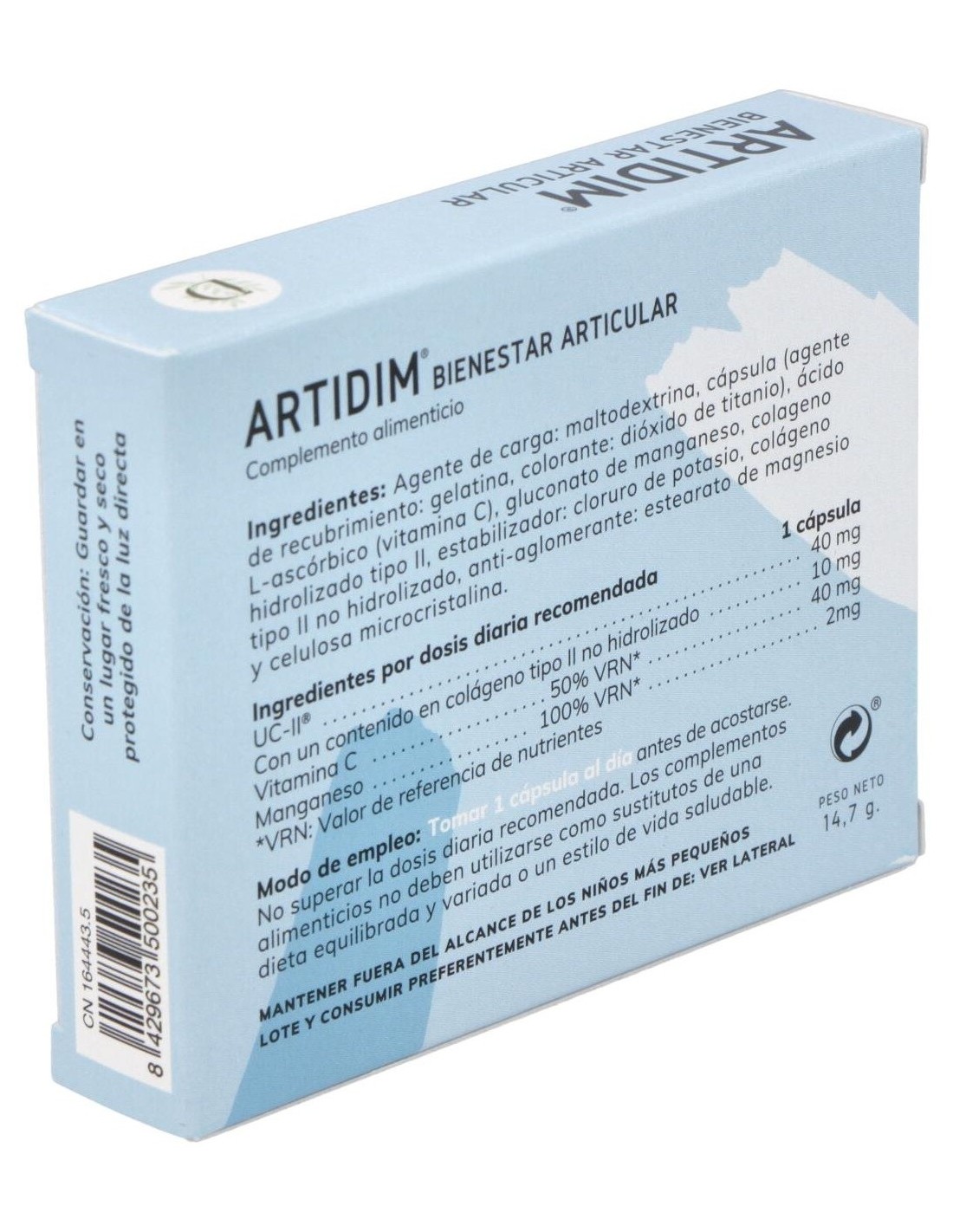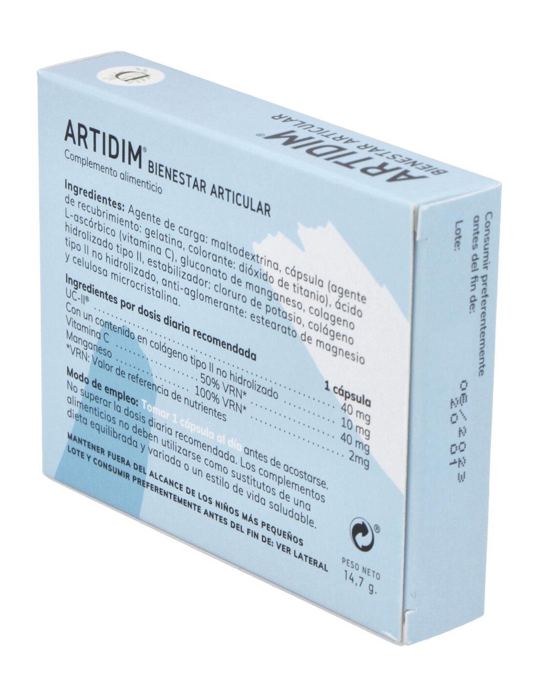 Dimefar Artidim 30Cáps es un complemento alimenticio a base de colágeno tipo II no hidrolizado, manganeso y vitamina C que contribuye a mantener la salud articular.