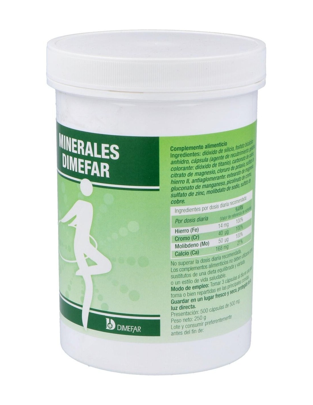 Dimefar Minerales 500Cáps es un complemento alimenticio elaborado a base de minerales esenciales que está especialmente pensado para aportar al organismo los oligoelementos que son necesarios para nuestro bienestar.