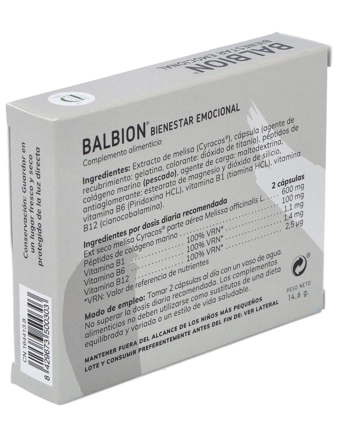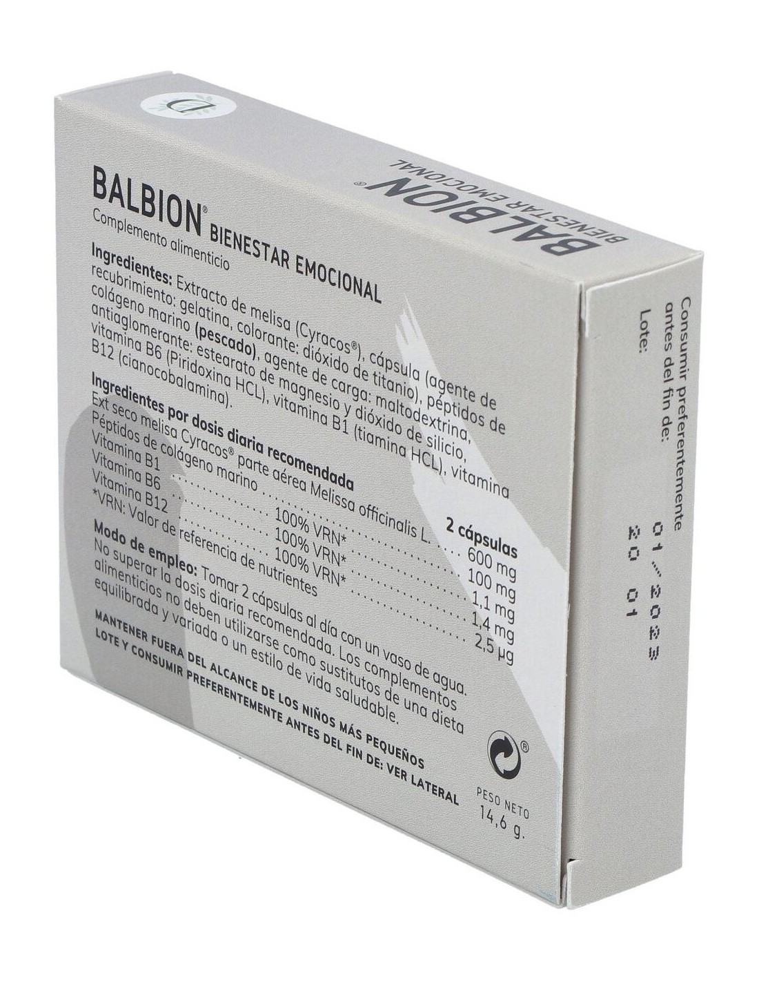 Dimefar Balbion 30Cáps es un complemento alimenticio a base de extracto de melisa de alta calidad combinado con extracto de péptidos marinos y vitaminas del grupo B (B1, B6 y B12).