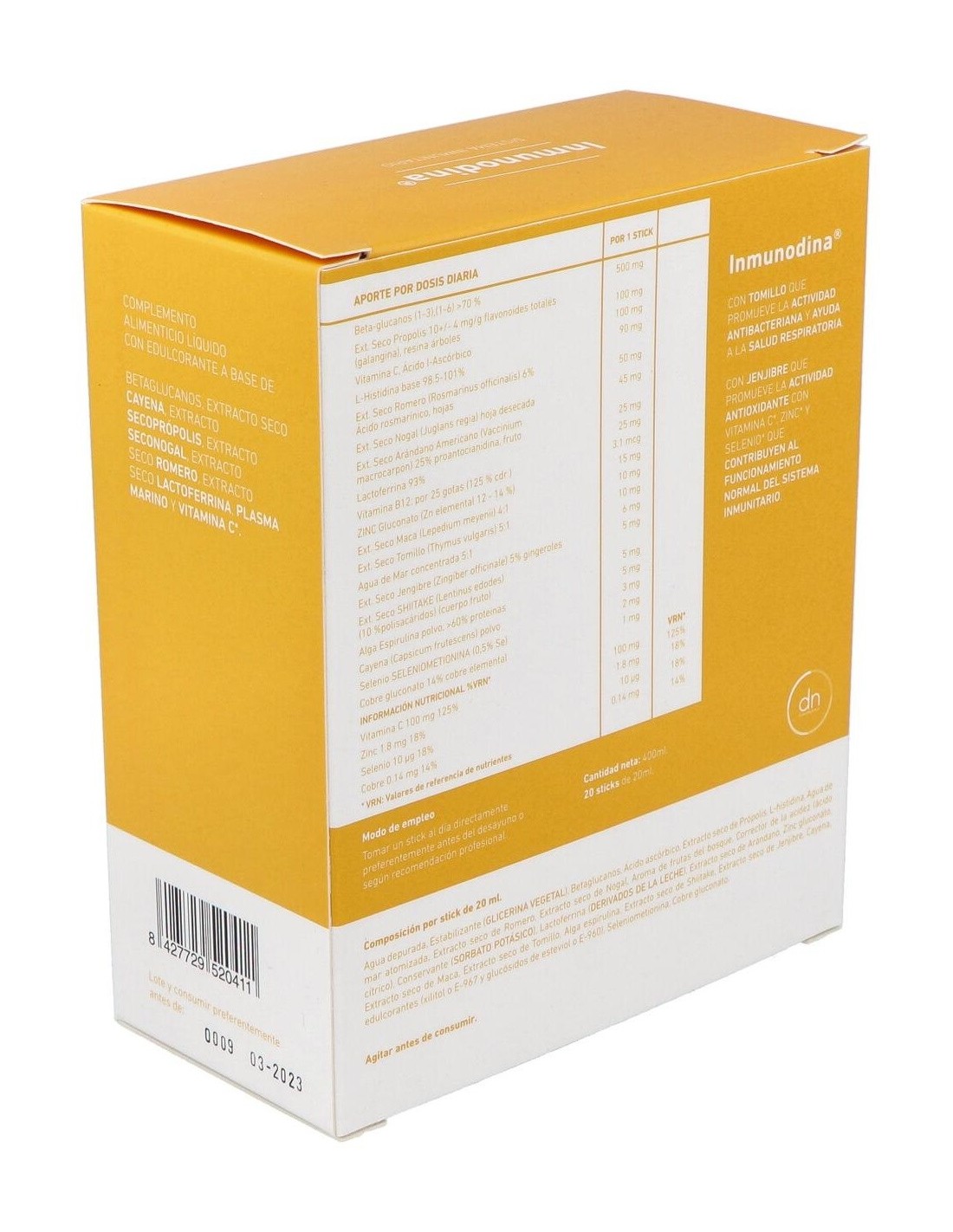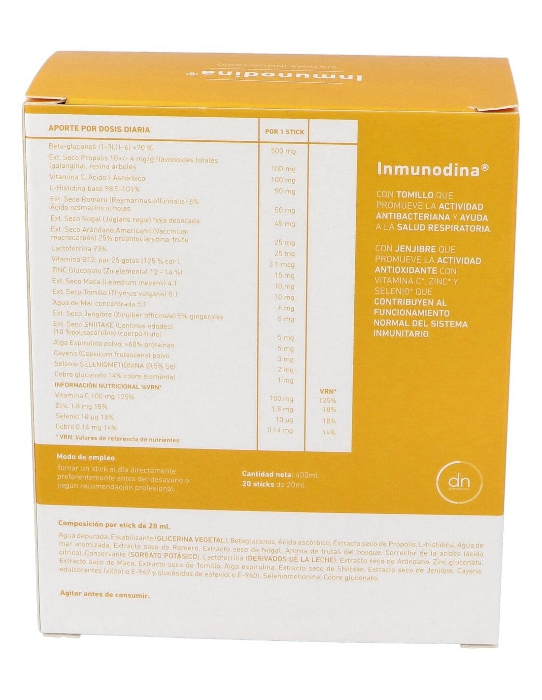 Por 1 stick:Beta-glucanos (1-3), (1-6)>70%, 500mg, E.S Própolis 10+/-4mg/g flavonoides totales (galangina), resina árboles, 100mg, Vitamina C (ácido ascórbico), 100mg, L-Histidina base 98.5-101%, 90mg, Agua de mar concentrada 5:1, 6mg, E.S Romero 6% ácido rosmarínico, hojas Rosmarinus officinalis, 50mg, E.S Nogal, hoja desecada de Juglans regia L., 45mg, Lactoferrina 93%, proteína bioactiva de leche bovina, 25mg, E.S Arándano americano 25% proantocianidina, fruto Vaccinum macrocarpon, 25mg, E.S Maca 4:1, raíz Lepedium meyenii, 10mg, E.S Tomillo 5:1, hierba Thymus vulgaris, 10mg, Alga espirulina polvo, >60% proteínas, 5mg, E.S Shiitake (Lentinus edodes) (10% polisacáridos) (cuerpo fruto), 5mg, E.S Jengibre 5% gingeroles, raíz Zingiber officinale, 5mg, Zinc gluconato (Zn elemental 12-14%), 15mg, Selenio (Seleniometionina) (0,5% Se), 2mg, Cobre gluconato 14% cobre elemental, 1mg, Cayena polvo, frutos Capsicum frutescens, 3mg, Stevia.