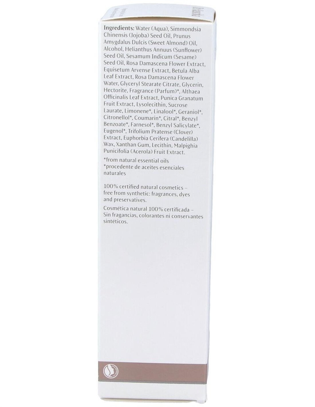 Water (Aqua), Simmondsia Chinensis (Jojoba) Seed Oil, Prunus Amygdalus Dulcis (Sweet Almond) Oil, Alcohol, Helianthus Annuus (Sunflower) Seed Oil, Sesamum Indicum (Sesame) Seed Oil, Rosa Damascena Flower Extract, Equisetum Arvense Extract, Betula Alba Leaf Extract, Rosa Damascena Flower Water, Glyceryl Stearate Citrate, Glycerin, Hectorite, Fragrance (Parfum)*, Althaea Officinalis Leaf Extract, Punica Granatum Fruit Extract, Lysolecithin, Sucrose Laurate, Limonene*, Linalool*, Geraniol*, Citronellol*, Coumarin*, Citral*, Benzyl Benzoate*, Farnesol*, Benzyl Salicylate*, Eugenol*, Trifolium Pratense (Clover) Extract, Euphorbia Cerifera (Candelilla) Wax, Xanthan Gum, Lecithin, Malpighia Punicifolia (Acerola) Fruit Extract. *componente natural de aceites esenciales