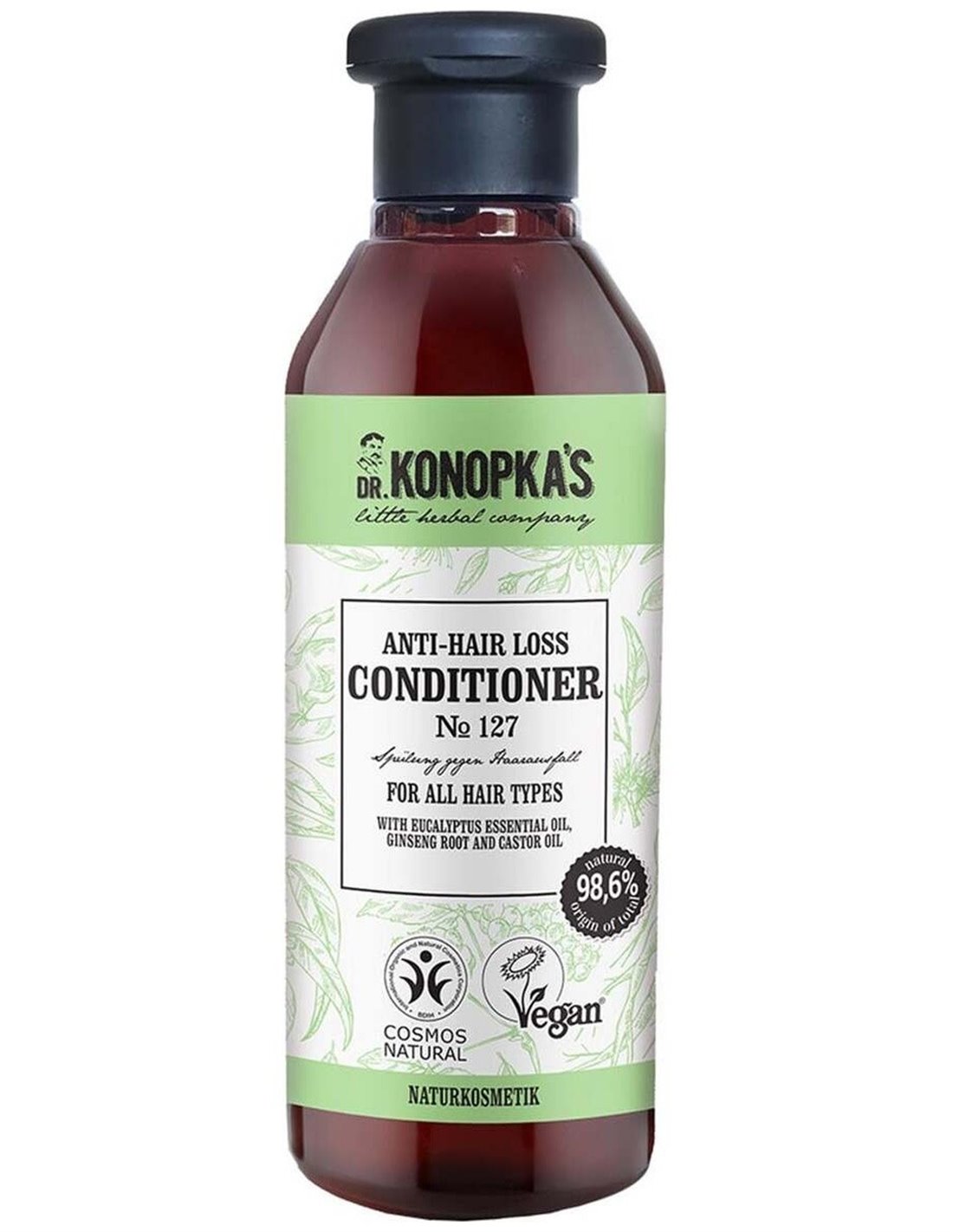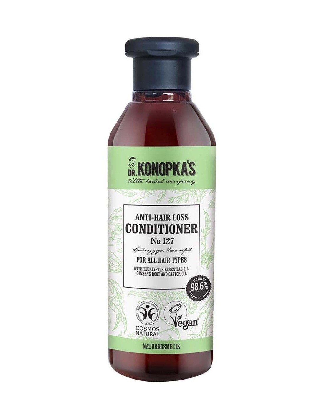 DR. KONOPKA´SEste acondicionador está formulado especialmente para el cabello débil con tendencia a la caída: le devuelve su plenitud y fuerza. La raíz de ginseng orgánica, el aceite de ricino y el aceite esencial de eucalipto ayudan a prevenir la caída del cabello y lo nutren y revitalizan de la raíz a las puntas para que crezca fuerte. Certificado BDIH Cosmos Natural y Vegan.