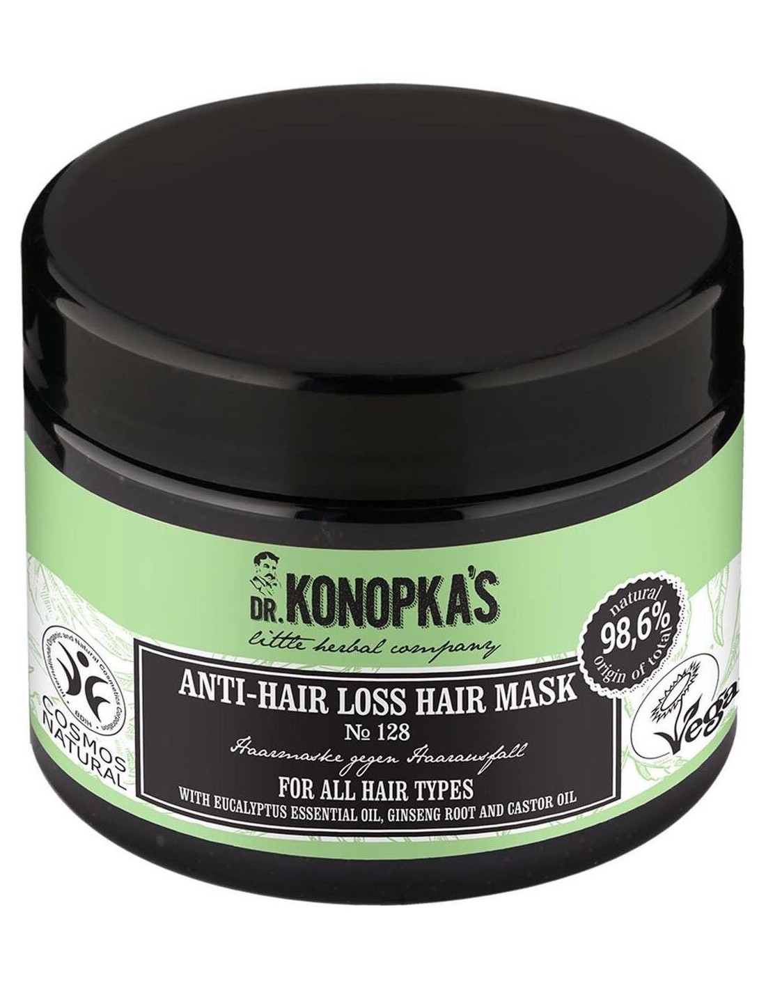 DR. KONOPKA´SEsta mascarilla está especialmente formulada para el cabello débil con tendencia a la caída: restaura su densidad y fuerza. La raíz de ginseng orgánica, el aceite de ricino y el aceite esencial de eucalipto revitalizan el cuerpo cabelludo para reducir la caída, hacer que crezca un cabello fuerte y nutrirlo y fortalecerlo de la raíz a las puntas. Certificado BDIH Cosmos Natural y Vegan.