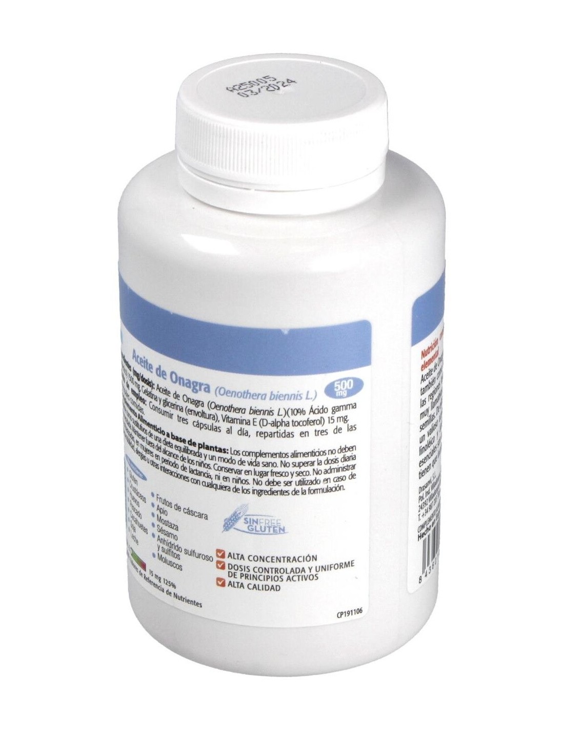 ACEITE DE ONAGRA (OENOTHERA BIENNIS L) CON APORTE EN ÁCIDO GAMMA LINOLÉNICO (10%). VITAMINA E (D-ALPHA TOCOPHEROL). GELATINA. GLICERINA.