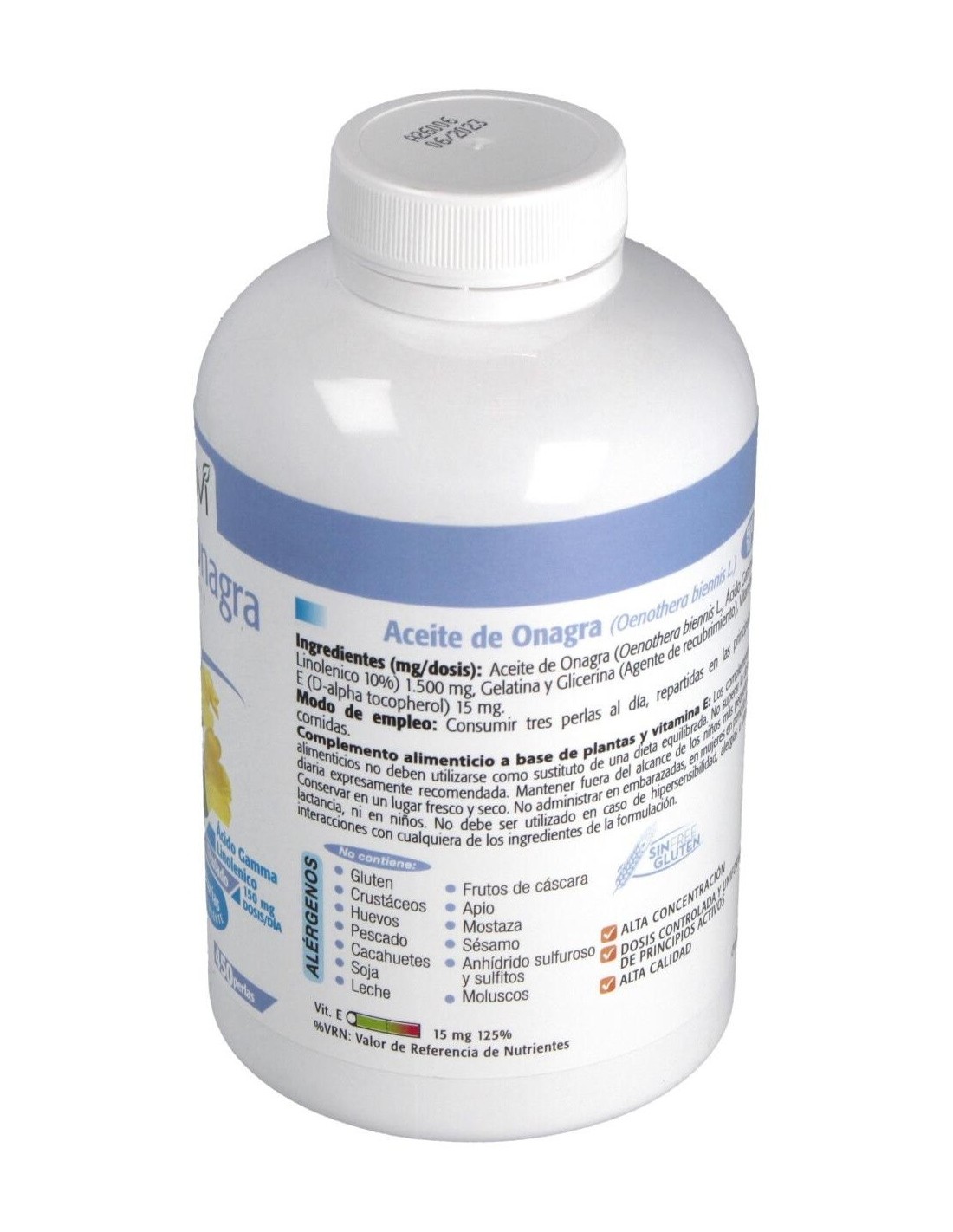 ACEITE DE ONAGRA (OENOTHERA BIENNIS L) CON APORTE EN ÁCIDO GAMMA LINOLÉNICO (10%). VITAMINA E (D-ALPHA TOCOPHEROL). GELATINA. GLICERINA.