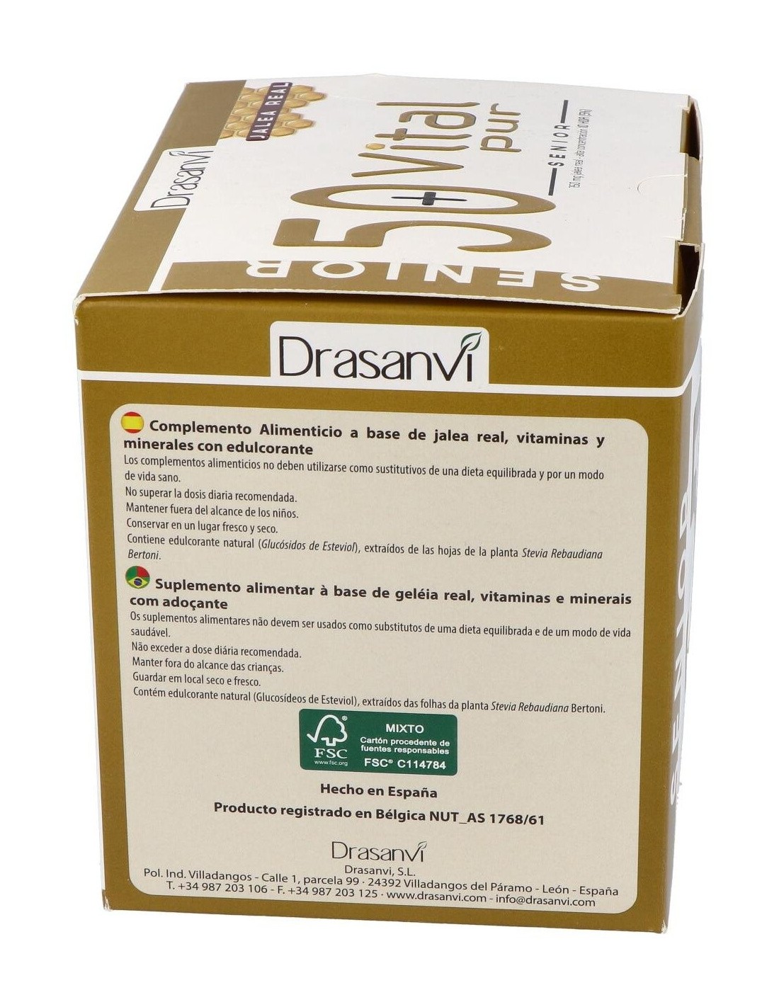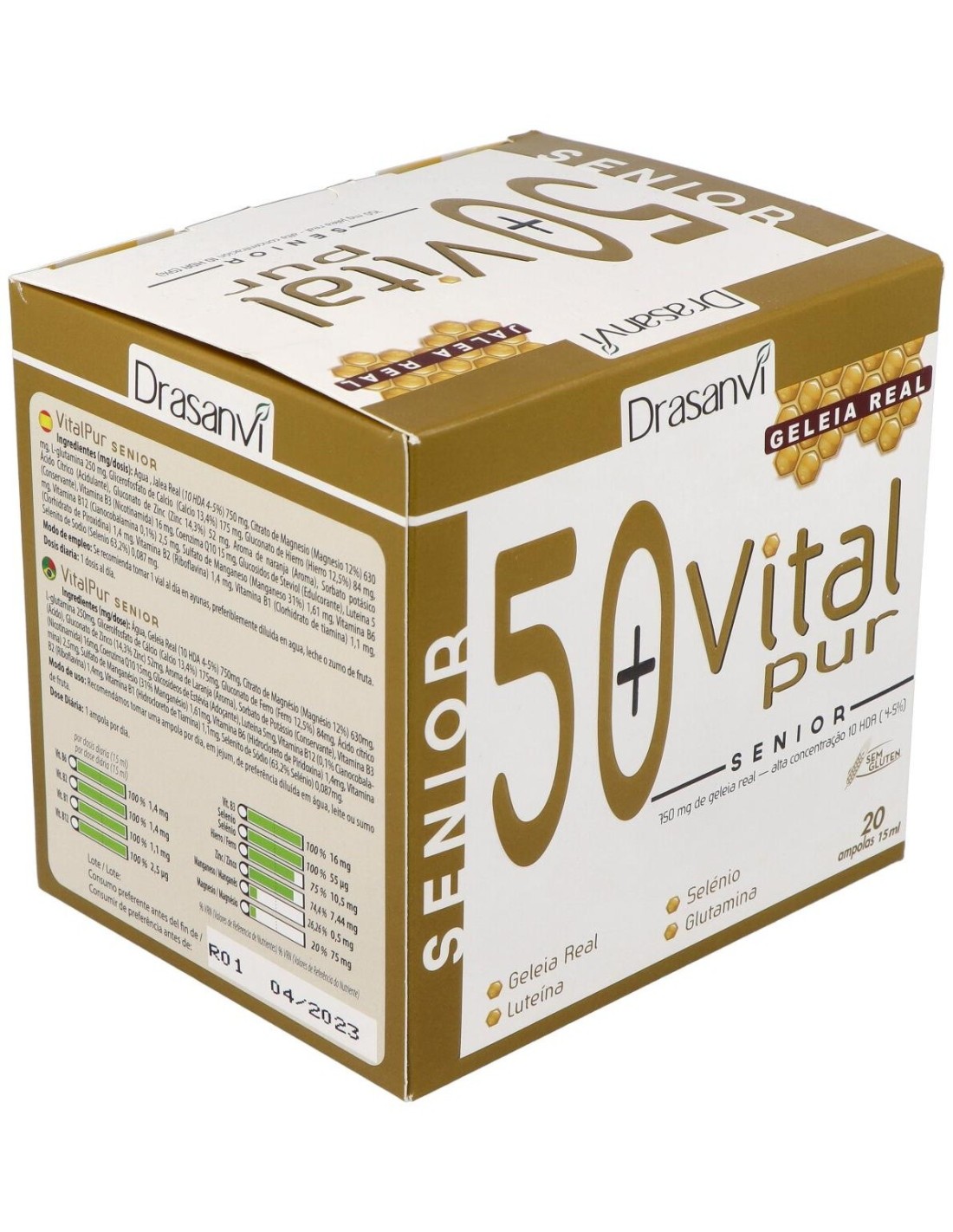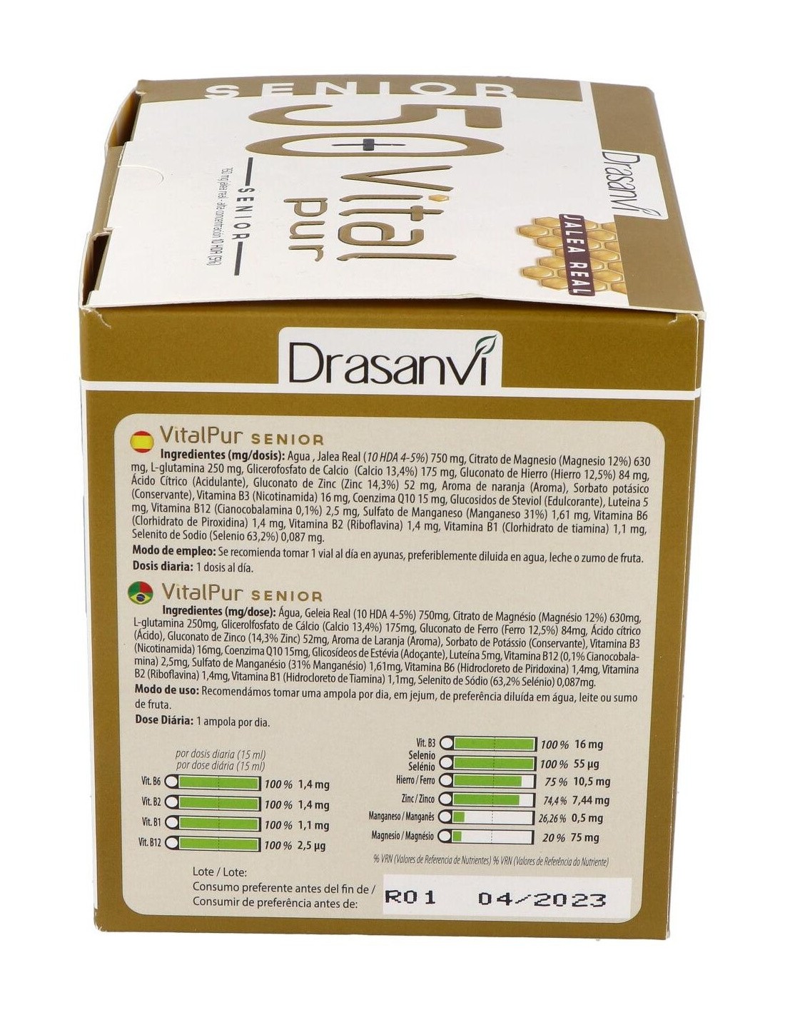 Complemento alimenticio, pensado para personas mayores de 50 años. Su ingrediente base es la jalea real (750 mg). La jalea real, es un ingrediente creado por la abejas para alimentar a las crías y a la abeja reina. Vitalpur Senior incorpora magnesio, que contribuye al correcto funcionamiento de los huesos en condiciones normales, minerales como el hierro que ayudan a disminuir el cansancio y la fatiga, ingredientes que contribuyen a la protección de células frente al daño oxidativo e ingredientes que contribuyen al mantenimiento de la visión en condiciones normales.