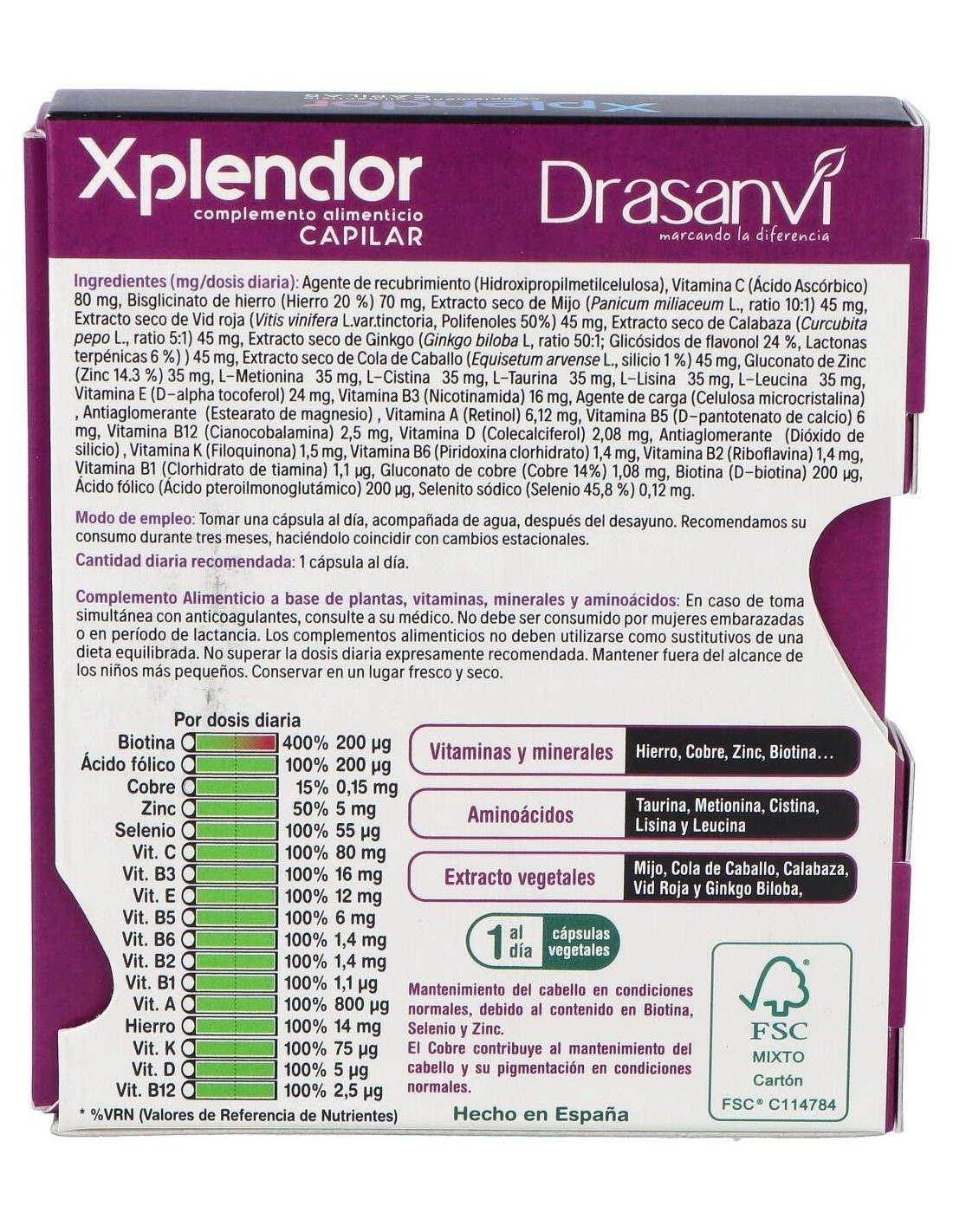 Suplemento con vitaminas, minerales, aminoácidos y extractos vegetales ricos en principios activos y ácidos grasos. El cobre y la biotina contribuyen al mantenimiento del cabello en condiciones normales. La vitamina A contribuye al normal mantenimiento de la piel.
