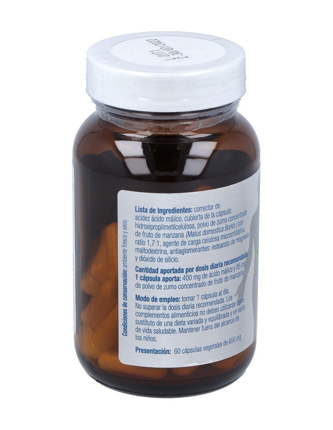 Corrector de acidez ácido málico, polvo de zumo concentrado de fruto de manzana (Malus domestica Borkh.) con ratio 2,5:1, agente de carga celulosa microcristalina, maltodextrina y antiaglomerante estearato de magnesio. Cubierta de la cápsula: hidroxipropilmetilcelulosa.